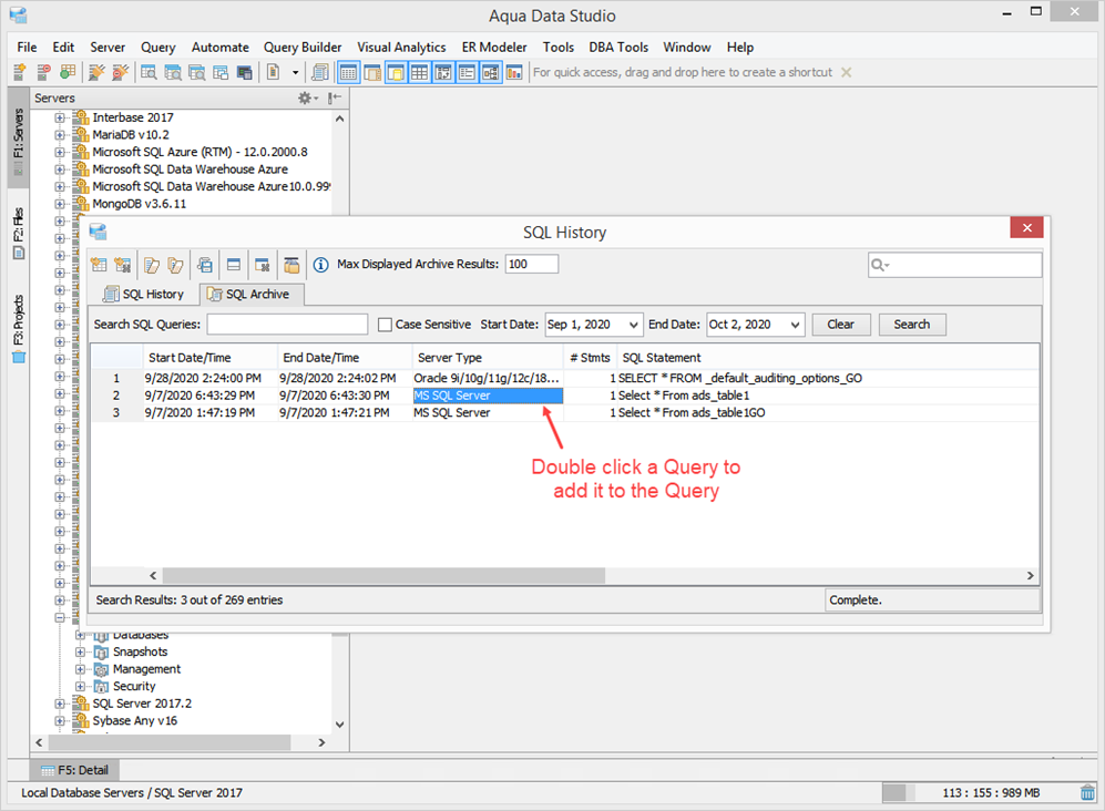 Aqua Data Studio includes an SQL History, and SQL History Archive which provides a history of all SQL statements and scripts that have been executed within the Query Analyzer, Query Builder, Table Data Editor and SQL Debuggers. Double clicking on an SQL History item writes it into the current tool for re-execution or editing. To view detailed SQL Logs captured from all areas of Aqua Data Studio, see the SQL Log page. Launching the SQL History