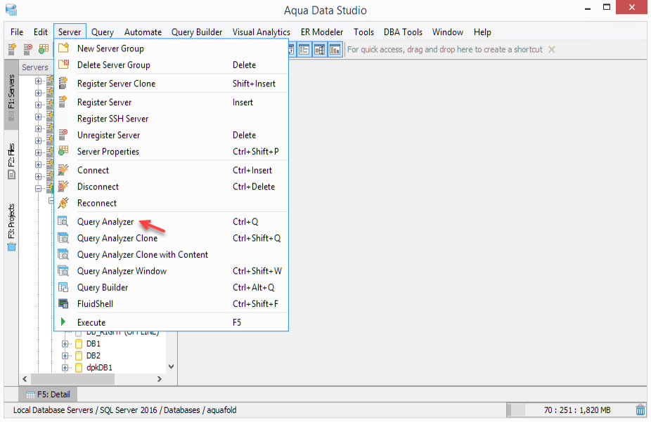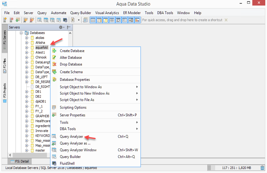 To execute and edit a SQL query, you have to Register a Server in Aqua Data Studio. To make sure you are using the correct database, it is always best to launch the Query Analyzer tool from the server in the Schema tree, on the left side list.