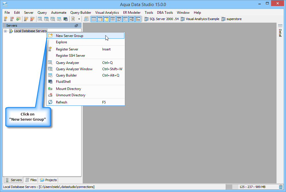 To create a SSH Server Clone of an already Registered Server, in Aqua Data Studio: