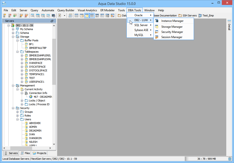 DB2 for LUW Database Administration (DBA) Tools - The DB2 for LUW Database Administration (DBA) Tools provide users with the tools to administer, manage and monitor all aspects of a DB2 for LUW database. The tools may be accessed from the application DBA Tools menu or from the schema browsers context sensitive popup menu. The following is a list of tools provided with a description of each tools functionality.