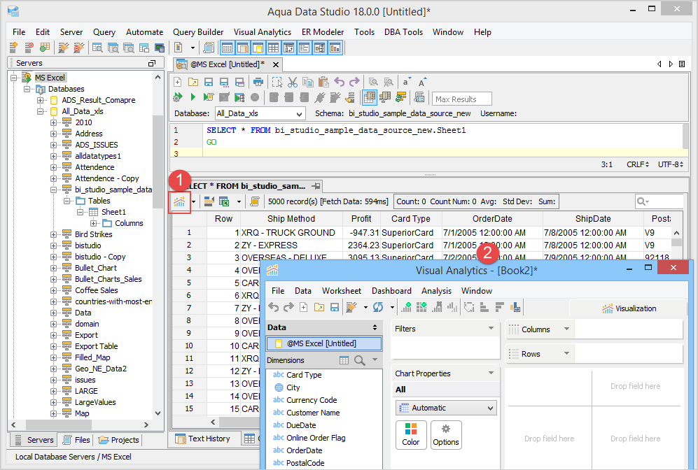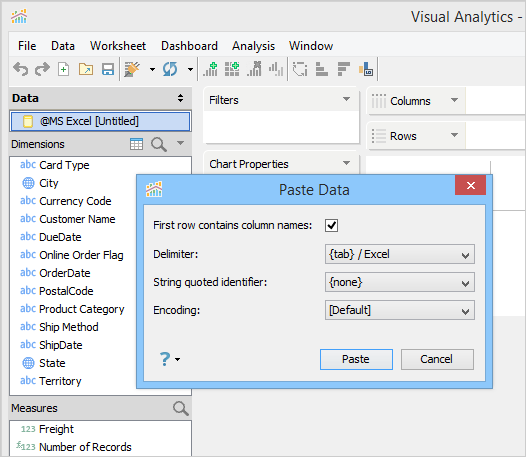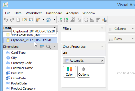 5. Behind the scenes, Visual Analytics creates an XLSX file from your pasted content in the "Aqua Data Studio Repository\datasources\clipboard_excel" directory and adds it as a data source.