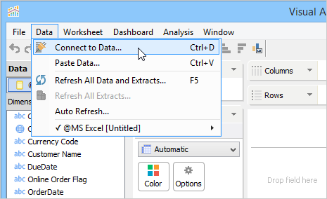 You can also connect to a Data Source by using [Data > Connect to Data...] from the Visual Analytics menu.