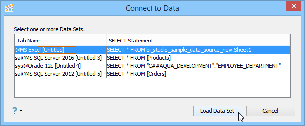 The [Connect to Data] dialog always lists the existing Data Set which Visual Analytics held when it opened. If you launched Visual Analytics from the Grid or Pivot Grid Results, you will see that query listed first. Every Query Analyzer tab from Aqua Data Studio will appear with its tab name listed on the left, and its select statement listed on the right.
