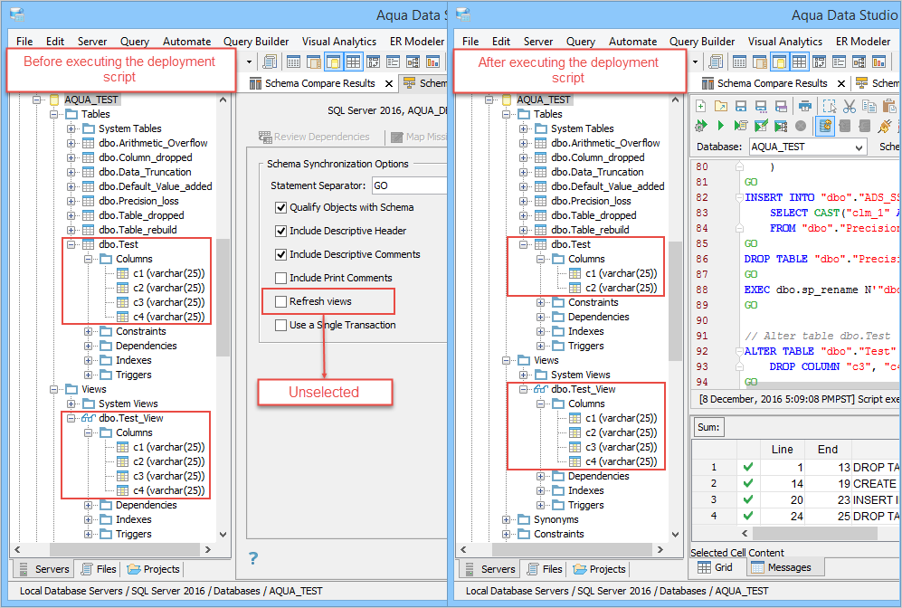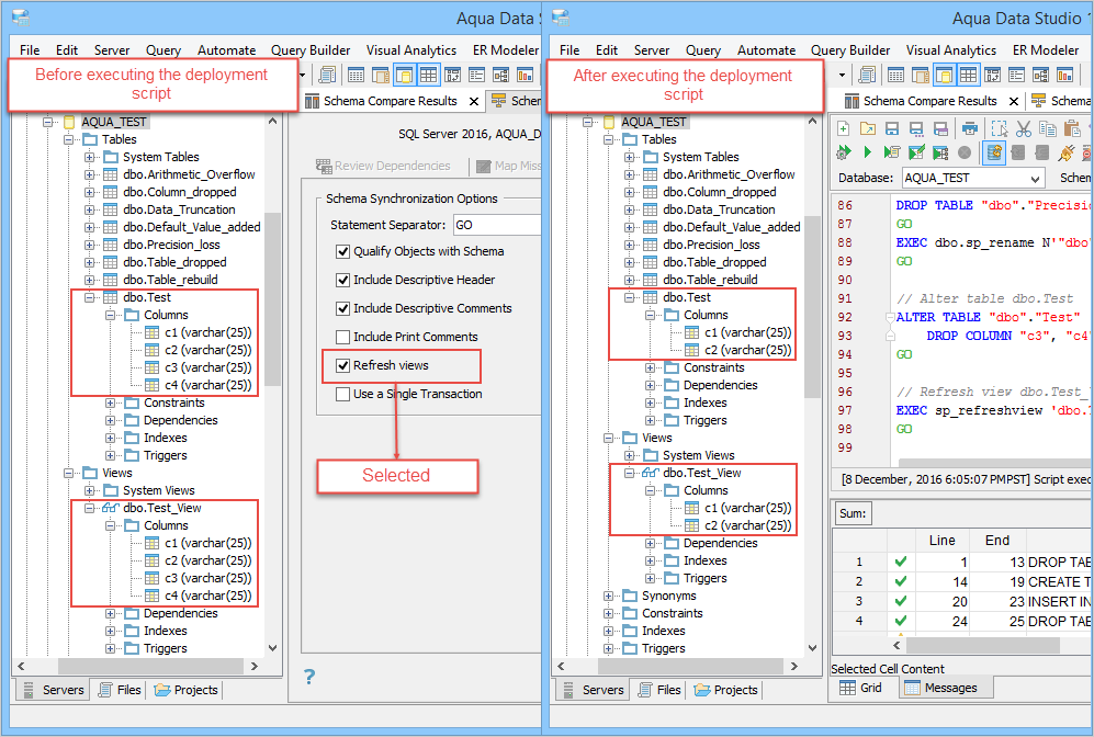 The definition of the target view will be refreshed based on the updated target object as Schema Synchronization will add the “sp_refreshview” procedure in the deployment script. This procedure will update the definition of the target view. So, in the following example, after the script is executed, c3 and c4 columns are dropped from the target table, and the view is refreshed.