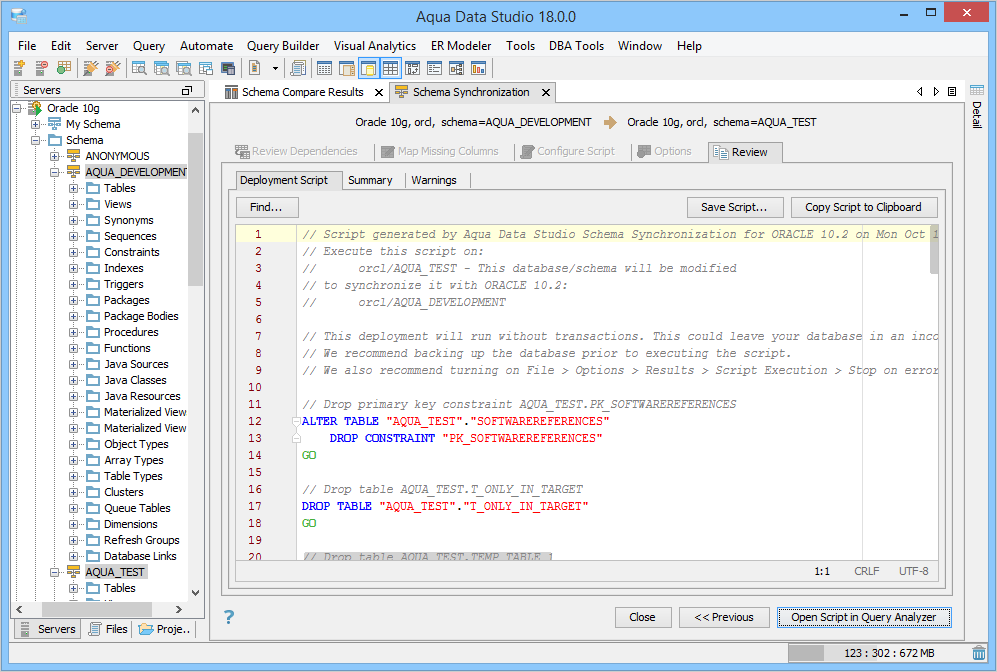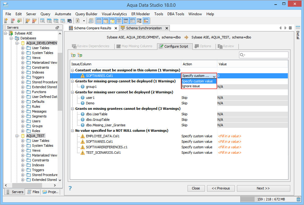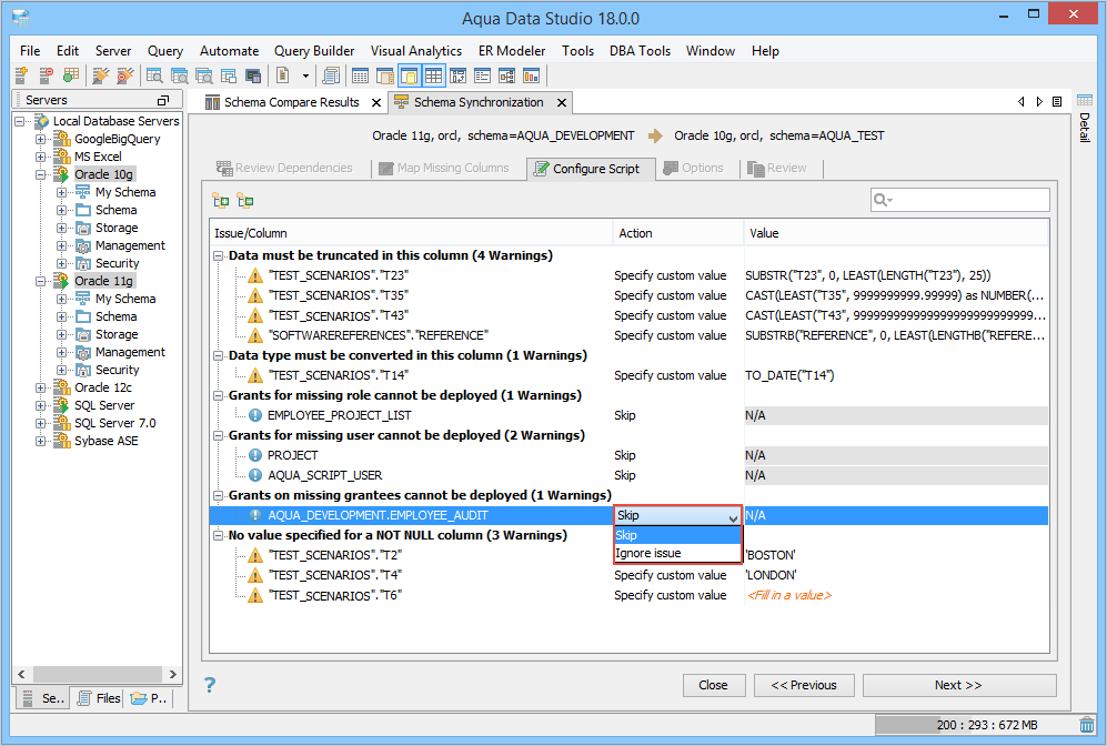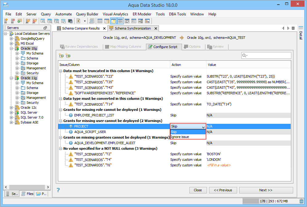 If you execute the deployment script without creating the missing user in the target database, the deployment script will fail.