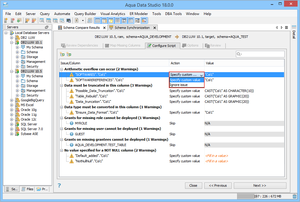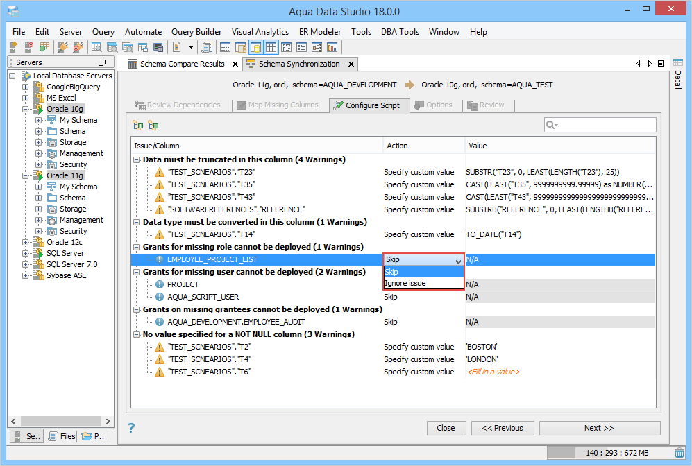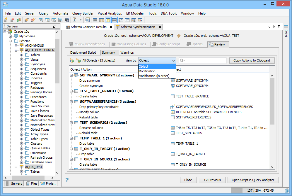 You see actions and modifications that Schema Synchronization will perform on the objects of the target schema. You can view these actions in different groups by selecting an option from the View by drop-down list.