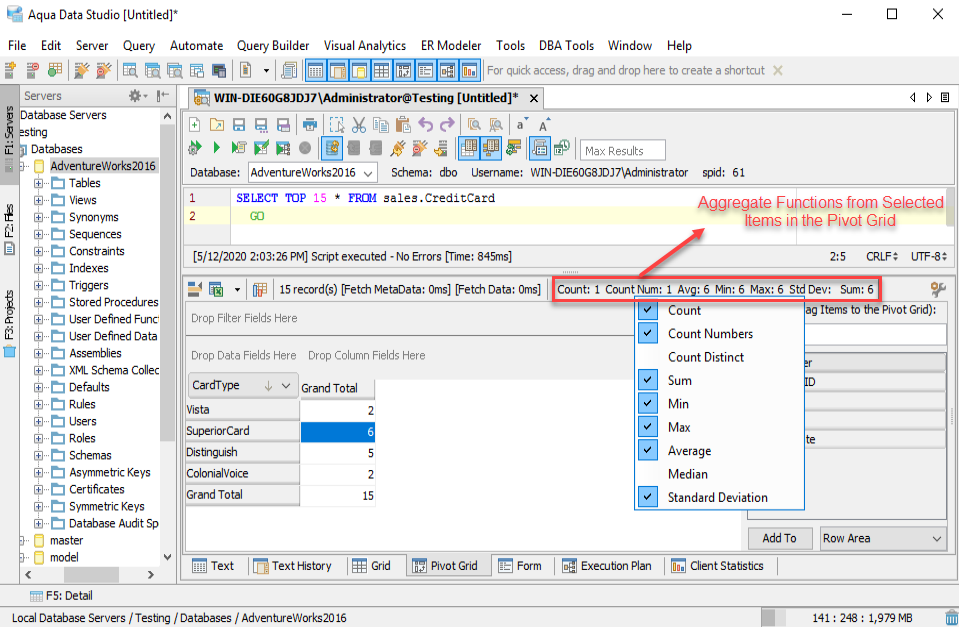 Aggregate Functions allow users to calculate Count, Count Numbers, Sum, Min, Max, Average, and Standard Deviation functions on selected cells in the grid data. Once data has been highlighted in the grid, right-click on the Aggregate Functions button at the top right of the grid. Choose the desired function and its results are displayed within the button itself. If the Grid Results Pane is too narrow, the Aggregate functions may collapse into an expandable box adjacent to the quickfilter input form. Clicking on the collapsed box displays its contents in an overlay at the top of the grid results. Pivot Grids Results also allow Aggregate Functions on selected data.