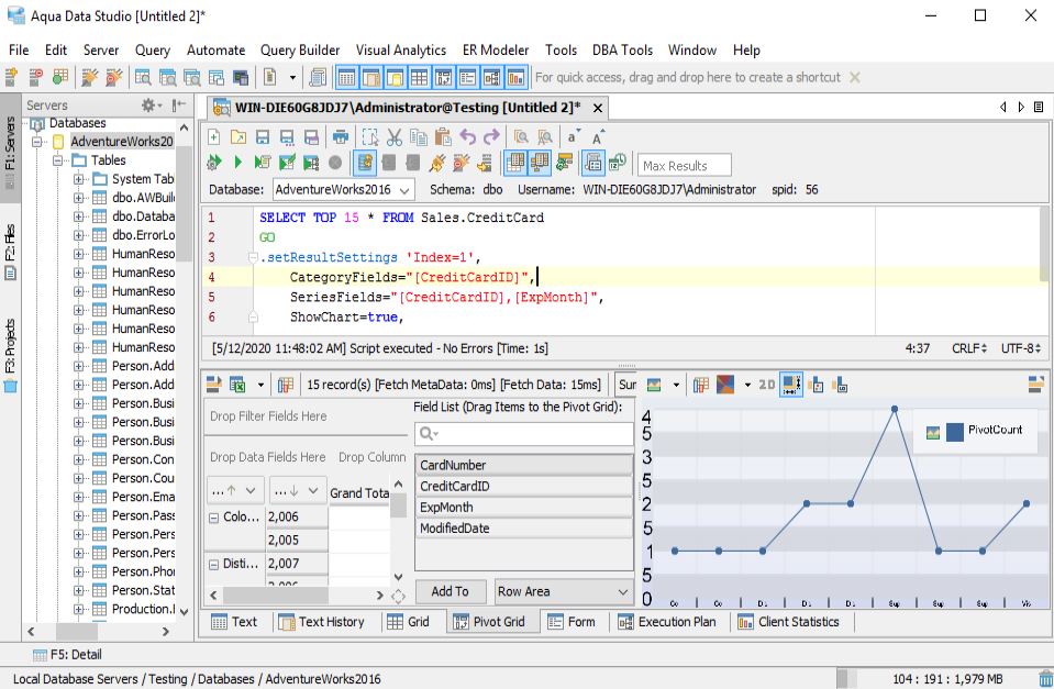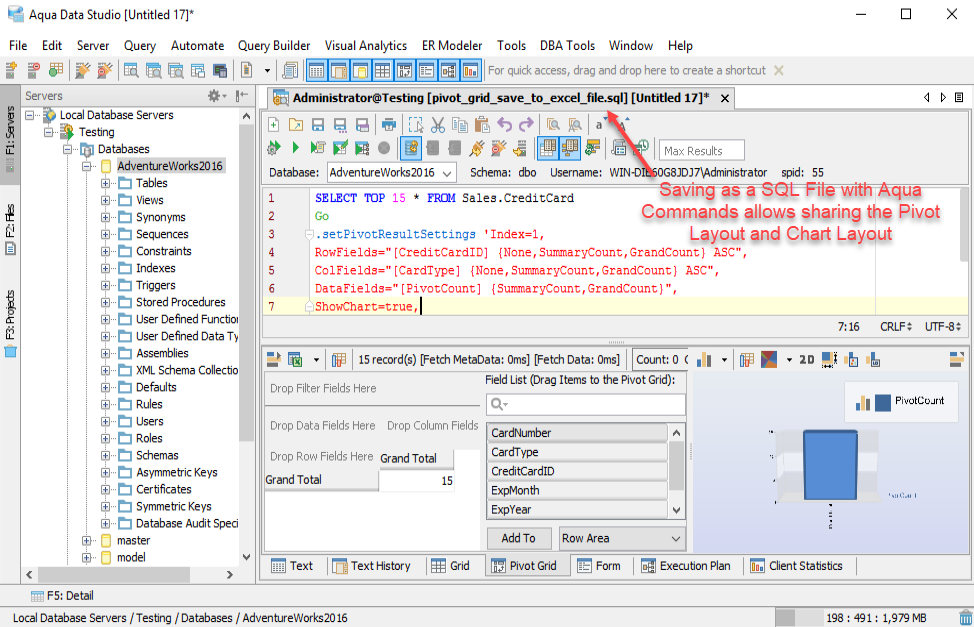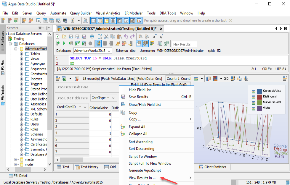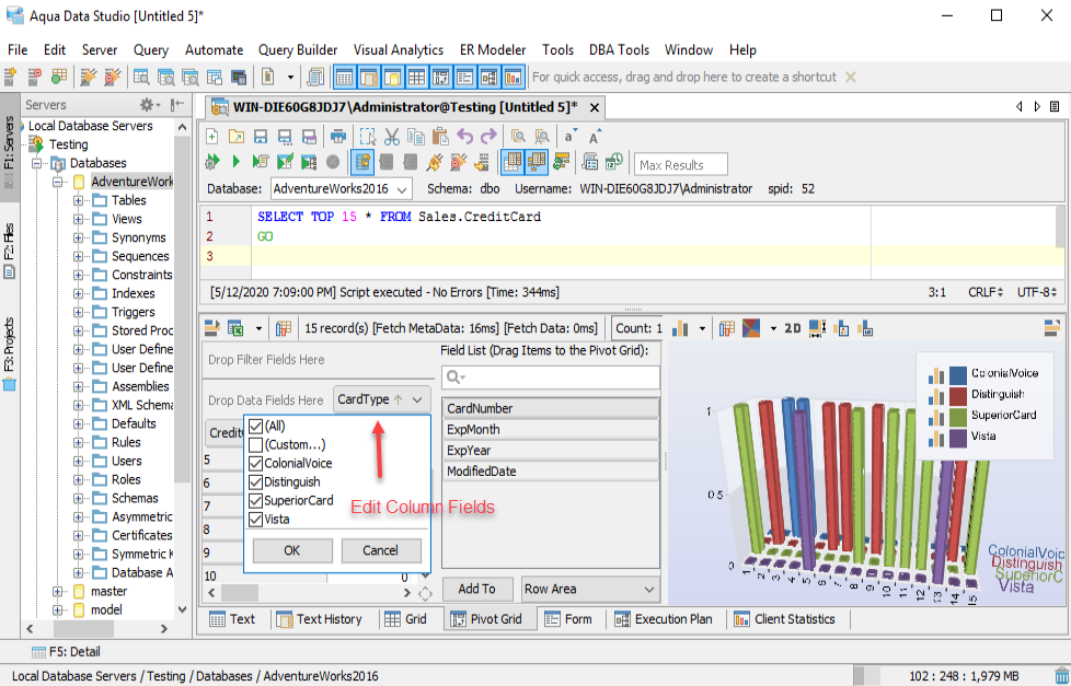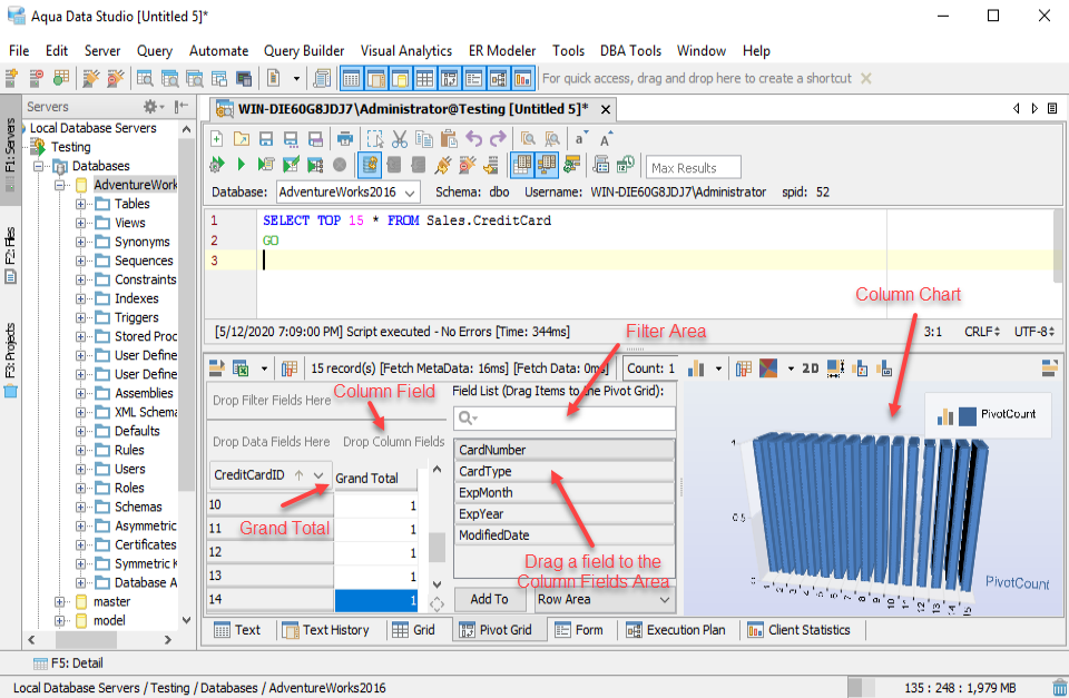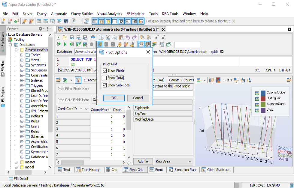 1.. Connect to the Database Server and Open a Query Analyzer. Execute the Query. Click on the Pivot Grid Tab and click on Show Chart 2. Drag Fields from the Fields list on the right into the Row Field area in the Pivot Grid's left side where it displays "Drag Row Fields Here" 3. Drag Fields from the Fields list on the right into the Column Fields area at the top of the pivot Grid where it displays "Drag Column Fields Here" 4. In the Chart display Area, select Column Chart Type. Change Chart Type if needed by selecting Column Chart, Stacked Chart, Bar Chart, Area Chart, Pie Chart, Line Chart or Surface Chart. The Chart Type can be set per series by clicking on the legend and choosing a different type 5. Edit the Column Fields as needed. CardType is the Column Field and in the drop-down, only two items from CardType are selected so that the columns are returned on the basis of this filter 6. Select the Chart Type in the Chart Display Area. The Chart view can be freely rotated in three dimensions by left-clicking and dragging the mouse across the chart. To zoom in and out, hold down shift and left-click and drag up and down across the chart. To reposition the chart, CTRL+drag moves the chart within the view 7. Review the Aqua Commands script this chart would create within the Chart Options Script tab. If this script were shared with Aqua Data Studio users, they would see an identical chart layout. Just like the Grid Results Charts, a right-click on the Chart allows saving as an image which can also be emailed 8. Right-click and select View in Excel Viewer to see how the Pivot Grid displays in Excel 9. View the Pivot Grid viewed within Excel 10. To save the Pivot Grid and the associated Pivot Grid Chart as an Excel Worksheet, right-click in the Pivot and select Save Results or click the Save Results icon 11. To generate Aqua Commands to script both the Pivot Grid layout and Pivot Grid Chart, right-click in the Pivot Grid and select Script to Window. Saving the Query Analyzer Window contents as a file preserves the layout and settings for later use 12. Select Pivot Grid Options as needed, any changes take place immediately in the chart. Executing the contents of the Query Analyzer will update the chart and grid with any data that has changed since the previous execution 13. Aggregate Functions like Sum, Count, Min, Max, Average, Standard Deviation are available for data selected from the Pivot Grid 14. Just like the Grid Results Charts, a right-click on the Chart allows saving as an image 15. Save the Query and Aqua Commands script for generating the Pivot Grid and Pivot Grid Chart with the layout for sharing or reuse 16. Right-click on a Pivot Chart to Generate an AquaScript. 17. Indicate a name and AquaProject to save it in. 18. The AquaScript Editor will open in a tab with that AquaScript. See the AquaScripts and AquaProject section for more information.