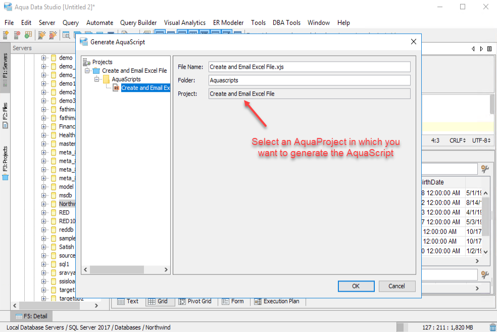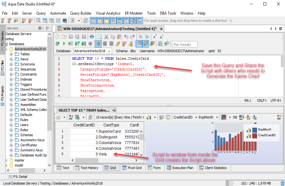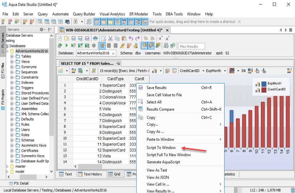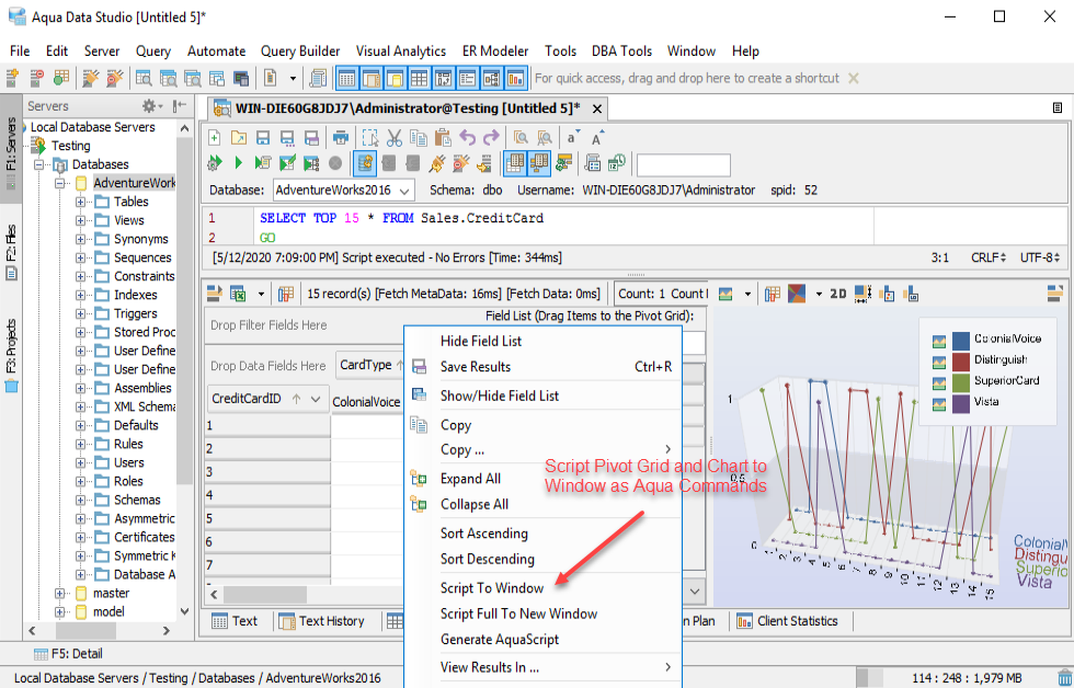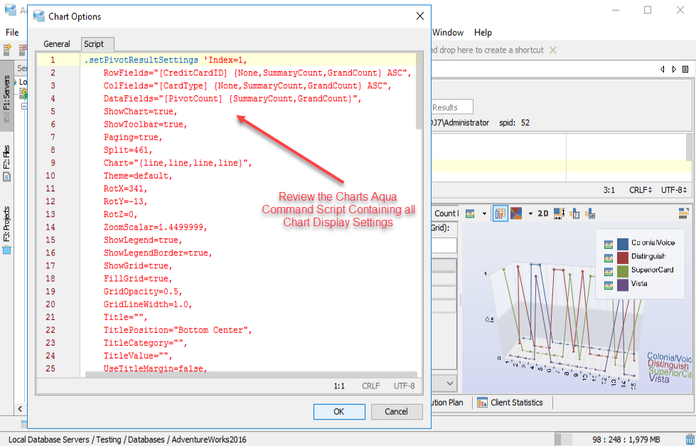 The Script to Window menu option automatically generates Aqua Commands for the pivot grid/pivot chart for exporting by right-clicking within the grid view. This generated Aqua Command will include all of the settings of the grid/graph display. If these settings are stored with a query as a file, users can re-execute and generate the same grids and graphs again as many times as needed. As data changes the chart dynamically changes with each re-execution of the query. Pivot Grids Results also have the Script to Window feature for generating Aqua Commands scripts.