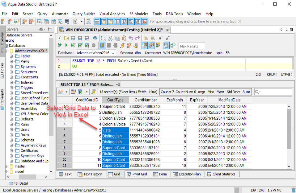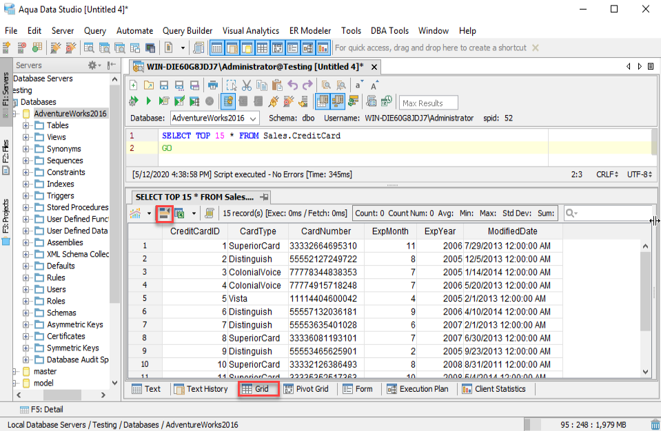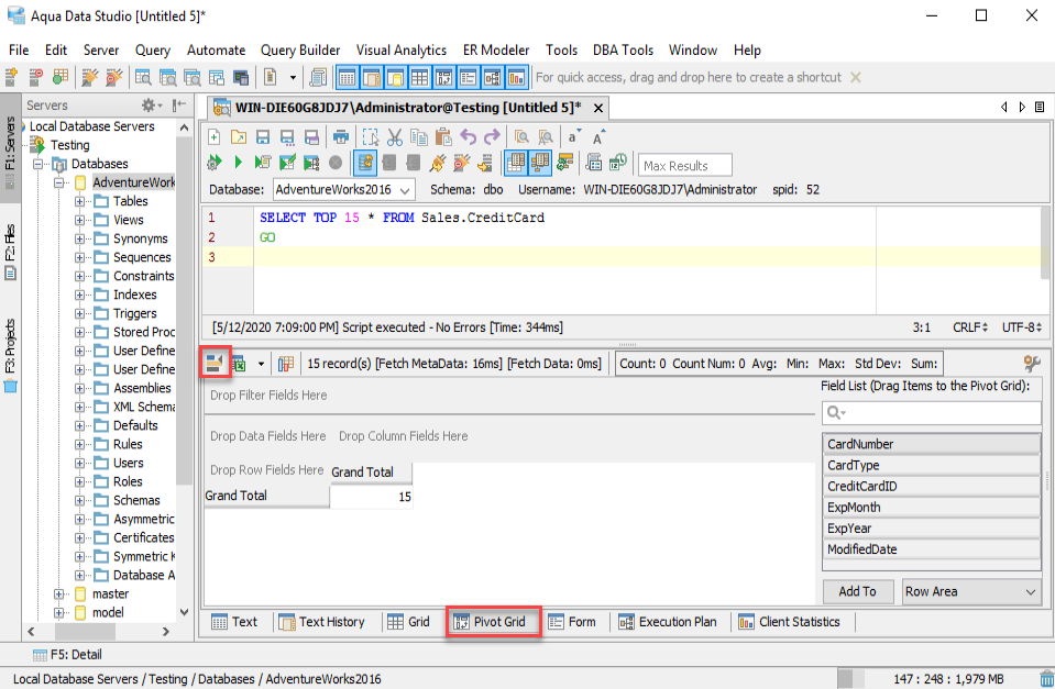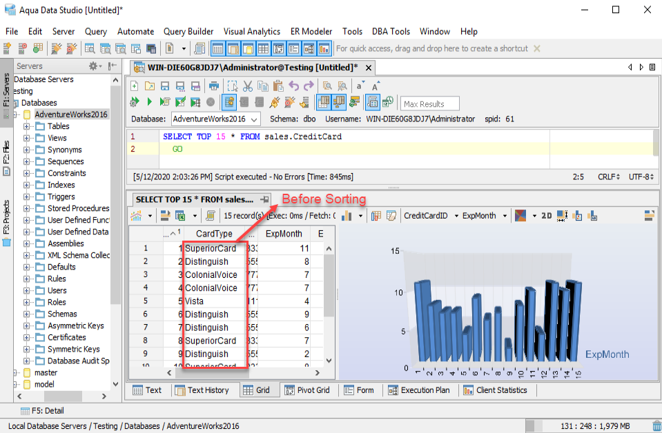 Grids, Grid Charts, Pivot Grids, and Pivot Grid Charts are available through the Query Analyzer Window as tabs (when enabled in the Main Application Toolbar) for any queries on any database Aqua Data Studio can connect to. Grid Results are the most common method of displaying query results, and they are also the recommended method of displaying large results sets (100,000 rows or more) as memory consumption has been highly optimized. Other features of the Grids Results include sorting, column rearrangement, quickfiltering displayed results, aggregate functions on selected cells, Script to Window for Aqua Commands, Save As, View in Excel Viewer, Grid Printing, and Charting. It is also possible to save charts as AquaScripts within AquaProjects by right-clicking on them. Grid results display data from tables and queries within a grid that can be sorted and rearranged. Column data can be Sorted in descending or ascending order by lerft-clicking on column headers. If the Control key (CTRL) is pressed during sorting, multiple columns can be sorted in sequence. Resorting columns can also change how the chart displays.