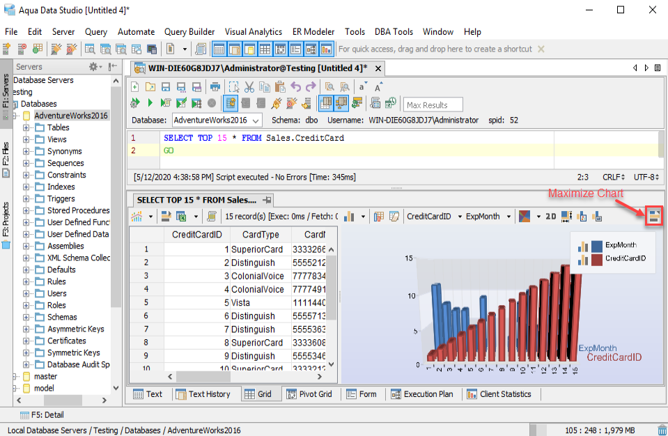 1. Connect to the Database Server and Open a Query Analyzer 2. Type in the Query for which you want to view the Charts, in the Query Analyzer and Execute the Query 3. Click on Grid Tab, to enable the Chart View Click on Show Charts Icon near records(s) [Fetch MetaData: /ms] [Fetch Data: /ms] 4. The Chart Display Area is blank 5. Select a Series in the Chart Display Area within the Chart's Toolbar 6. Select a Category in the Chart Display Area within the Chart's Toolbar 7. A chart is generated. Select desired Chart Options and Advanced Chart Options - Series such as series color, Legend Display, and other options 8. Maximize the Chart to check if its contents are what is needed. The view can be freely rotated in three dimensions by left-clicking and dragging the mouse across the chart. To zoom in and out, hold down shift and left-click and drag up and down across the chart. To reposition the chart, Ctrl + drag moves the chart within the view 9. Change Chart Type if needed by selecting Column Chart, Stacked Chart, Bar Chart, Area Chart, Pie Chart, Line Chart or Surface Chart. The Chart Type can be set per series by clicking on the legend and choosing a different type 10. View the list of Chart Types and swap if needed 11. The Chart changes immediately upon choosing a new Chart Type 12. Select a different Chart Theme: Apex, Civic, Concourse, Equity, Flow, Foundry, Median, etc. 13. The 2D 3D button swaps the chart from a 2D chart to a 3D chart 14. Right-click on the Chart and to save it as an Image 15. You can Script to Window, creating an Aqua Command script as part of the query 16. Saving this script, with the charting Aqua Command allows sharing of the chart with others who need to run the same query 17. Right-click on a chart to Generate an AquaScript 18. Indicate a name and AquaProject to save it in 19. The AquaScript Editor will open in a tab with that AquaScript. See the AquaScripts and AquaProject section for more information.