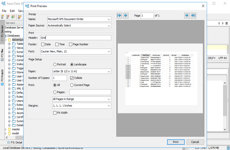 Right-clicking within a grid and selecting Print allows printing of grid results alone. The Print Preview displays margin, page orientation and individual page previews for each page printed if the grid is wider than a single page width.