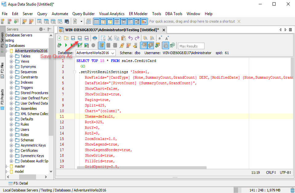 After generating a script, using "Save As" from within the query toolbar makes it possible to save the query and Aqua Commands together in a shared file or directory so that multiple users of Aqua Data Studio can access the layout and results.