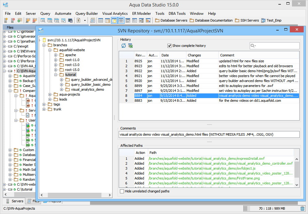 How to update a Version Control file or repository Within the scripts pane, right click on a repository, directory or file and select Update. This will retrieve the latest version from the remote repository. How to add a file to Version Control Within the scripts pane, left click on a file, files or directory to select, then right click to select "Add". This will include the selection in the repository for versioning. How to delete a file in Version Control Within the scripts pane, left click on a file, files or directory to select, then right click and navigate to "Version Control" to select "Delete". This will delete the selection from the repository. Within the Repository Browser, right clicking on an item and selecting Delete functions the same way. How to revert a file in Version Control Within the scripts pane, left click on a file, files or directory to select, then right click and navigate to "Version Control" to select "Revert". This will revert the selection in the repository. How to Show History in Version Control Within the scripts pane, left click on a file, files or directory to select, then right click and navigate to "Version Control" to select "Show History...". This will display the Version Control history of the selection in the repository. Within the Repository Browser, expanding the tree to select the file or directory you wish to view the history on, then left clicking it brings up its history in the History Table. The history displayed in the Repository Browser and the history displayed when selecting Version Control->Show History work similarly. Show History Dialog (window) Right clicking on a versioned item in the Files Browser gives direct access to show the history of that item. The resulting Show History dialog provides a list of all of the version control actions on a file or directory, and the revision's contained files. By default, the Show History Dialog only shows the most recent changes. If the "Show Complete History" option is enabled, all of the actions taken since the creation of the repository will be listed. Each action can be inspected in a table with columns for Revision, Author, Date, Changes and Comments. Two items in this history can be selected and compared to show the differences in actions and content over time. An item in the history can also be selected to "show changes" in the file as a comparison to its previous revision. Once a revision is identified within the History, right clicking on it also allows a checkout of that specific revision or a revert to that specific revision. At the bottom of the Show History is an area displaying affected paths of a revision, with an option for hiding unrelated changed paths. The Subversion (SVN) Repository Browser is a convenient way to view all of the contents of a repository, even when no working copies have been mounted locally. While the Repository Browser shows details on item history, it does not show the status of local working versions. It is more for exploring the remote repository and its contents than managing the local versions of files. To Launch the Repository Browser, right click on an item in the Files Browser and select Version Control -> Browse Repository. A window appears with the url to the repository in its title. An expandable tree view appears on the left and a history for the selected items in the tree appears on the right. The Subversion (SVN) Repository Browser points to the repository root when launched and offers an in-depth, explorable view of all of the files in a repository without requiring a local version of its content. The repository is displayed as a tree where action can be taken on individual items, or they can simply be viewed. The History table within the Repository Browser allows opening and comparing of individual items by way of a popup menu. Tree content is obtained with a background thread so that Aqua Data Studio’s other tools can be used while information from the repository is being retrieved. In the Affected Paths display, unrelated changed paths can be hidden. Inside the tree, right clicking on items allows checkout, new remote folder, rename, move, branch, delete, copy url and refresh. The Browse Repository menu item invokes the browser, pointing to the repository root, showing a tree, history table, and a "show complete history" checkbox for viewing the complete history of items in the repository. Clicking on item in the history table can also shows affected paths when it is enabled. Repository Browser Tree popup menu Right clicking within the repository browser launches a menu with checkout, new remote folder, rename, move, branch, delete, copy url, and refresh menu options. Repository Browser History Table and popup menu The Repository Browser History contains much of the functionality of the Show History Dialog mentioned above. Clicking on items within the Repository Browser History Table brings up menu options for show changes, compare, open, compare with revision, compare repository revisions. The history content is obtained in a background thread, allowing Aqua Data Studio's other operations to continue uninterrupted. Additional Subversion features