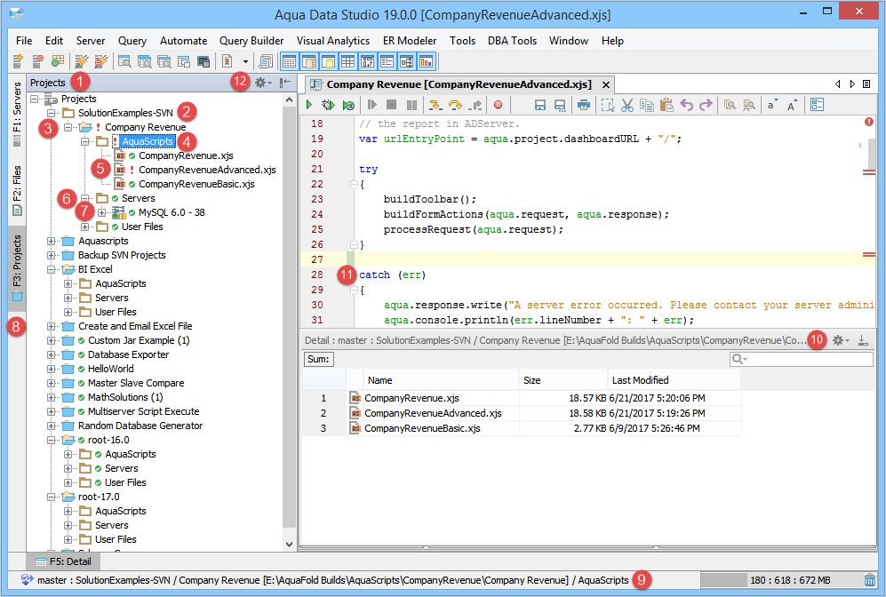 The Projects Browser functions as a navigational aid for AquaScript Project file management. Context sensitive menus are accessible through right-click on items within it or keyboard shortcut (ALT + DOWN ARROW). The Projects Browser can be separated or undocked as an individual window as part of the Workspace and Docking Framework of Aqua Data Studio. It uses a tree to display mounted folder and file contents, allowing for rapid location of files. When the Projects Browser is in focus, typing the first few letters of a word selects matching files or directories. When mounted local files are part of a file repository in Source Control or Version Control, the update status of files and directories appear as status indicators: up to date (green circle with a checkmark), out of date (red exclamation point), conflicted (gold triangle with exclamation point), or unversioned (empty circle). For more on Aqua Data Studio's version control client, and the Repository Browser, see Version Control in Aqua Data Studio.