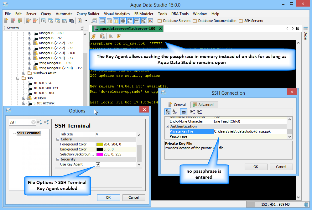 Using the Key Agent Options to cache Private Key Passphrases in Memory If you do not wish to store your private key passphrase to disk, enable the Key Agent within File > Options > SSH Terminal. This allows using a private key but instead of reading the passphrase from the registered server connection properties on disk, you are prompted for the passphrase in the terminal window the very first time you connect to the server. Once you enter the passphrase at the prompt, the passphrase is kept in application memory until Aqua Data Studio is closed. As long as you do not close Aqua Data Studio the cached passphrase will be used each time you connect to the server.