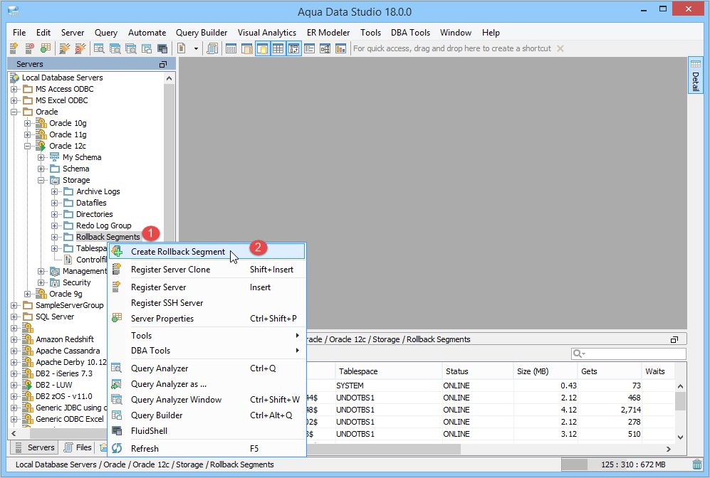 To create Oracle Rollback Segments, connect to an Oracle server and expand the tree to view the Storage container. Right click on Rollback Segments within the Storage container and select Create Rollback Segement. Enter the Rollback Segment name and Tablespace. Select its status as Online or Offline. In the Storage tab Set the Extents Initial Size, Next Size, Optimal Size, Minimum Number and Maximum number. View the SQL in the Preview SQL tab. Click OK to finish.
