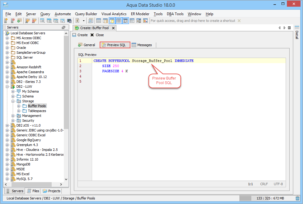 To create a DB2 Buffer Pool, expand the DB2 Storage container and right click on Buffer Pools to select Create Buffer Pool. Enter a Buffer Pool name and select a page size. Under the Buffer Pool Size section, select the size and the number of Non-blocked and Blocked Pages. Select the Block size in pages. Under the Options section choose Self Tuning or Use default Buffer Pool size. Select Create Buffer Pool on database restart or Create Buffer Pool immediately. Preview the SQL in the SQL Preview tab. Click OK to finish.