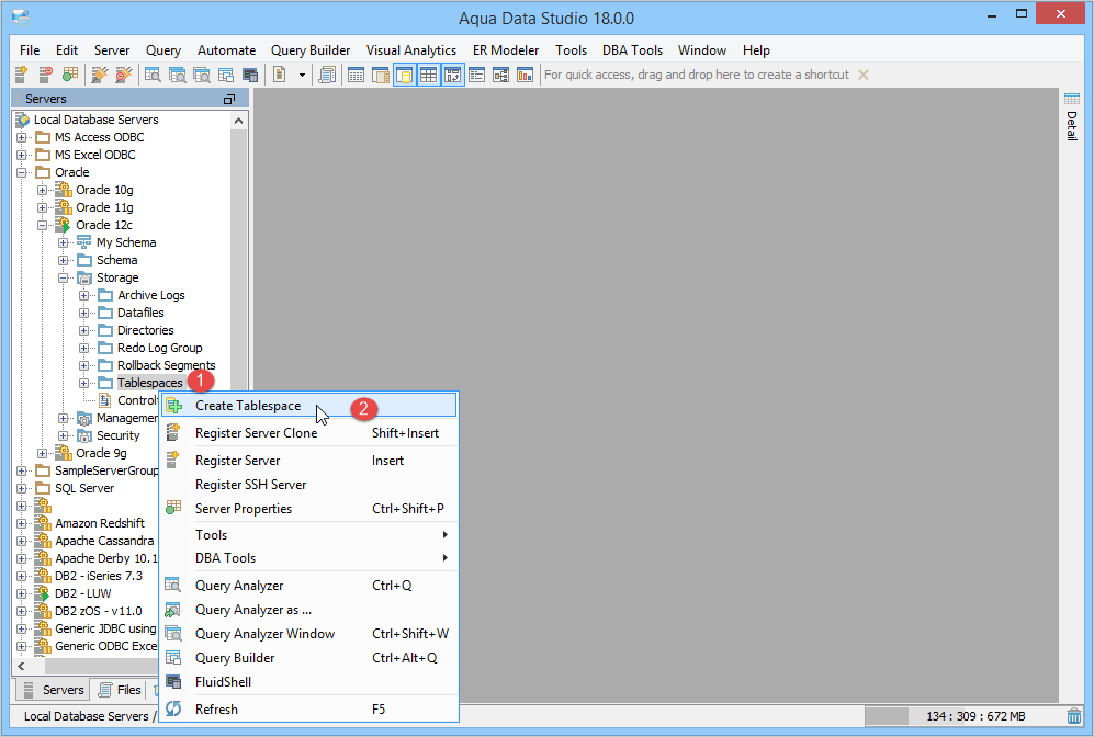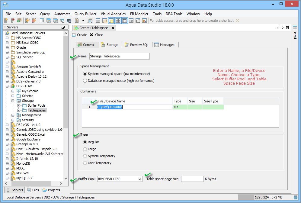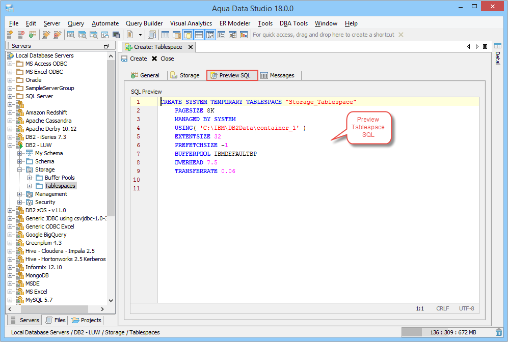 Aqua Data Studio provides visual editors for creating database Storage objects. By navigating the schema browser you may locate the Storage container (a hard drive shaped icon) underneath server connections. Storage objects vary based on database vendor and version.