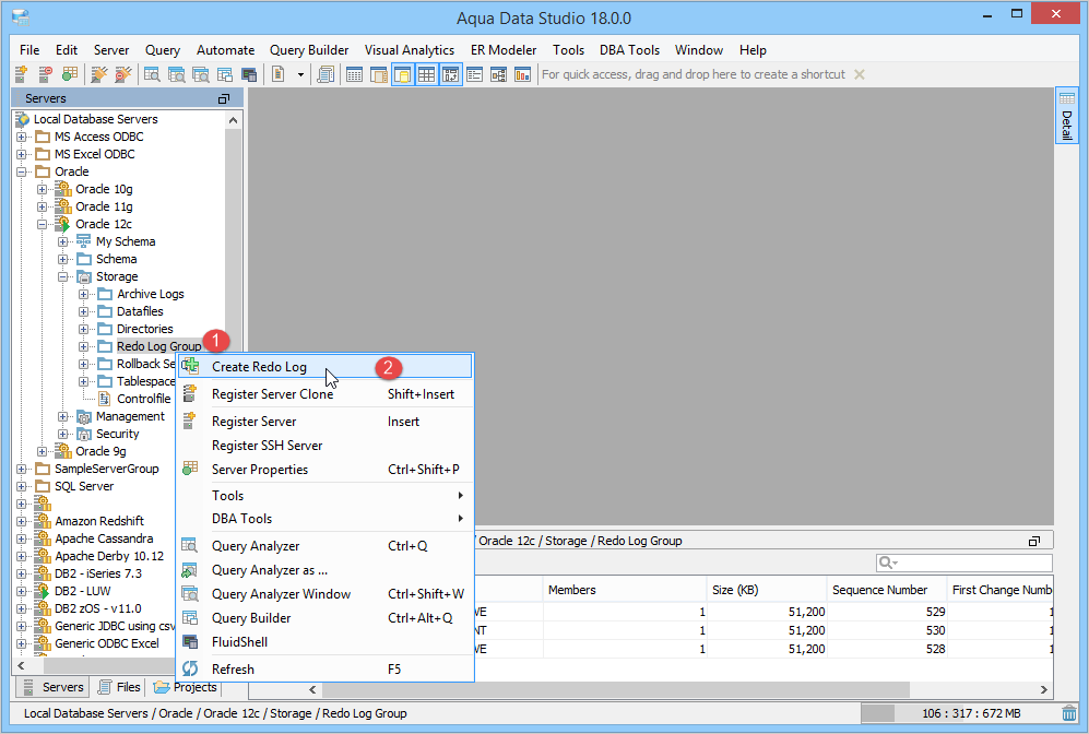To create Oracle Redo Log Group, connect to a serverand expand the tree to view the Storage container. Right Click on Redo Log Group within the Storage container and select Create Redo Log. Enter the name for the Log Number, set the filesize and name the file and its directory. View the SQL in the Preview SQL tab. Click OK to finish.