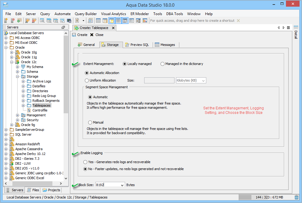 To create Oracle Tablespaces, connect to an Oracle server and expand the tree to view the Storage container. Right click on Tablespaces within the Storage container and select create Tablespace. Enter Tablespace Settings for Datafile name, file directory location, Status and Type. In the Storage Tab, set the properties for Extent Management (Automatic or Uniform Allocation), Segment Space Management (Automatic or Manual), and Logging. Adjust the Block Size as needed. Preview the SQL in the Preview SQL tab. Click OK to finish.