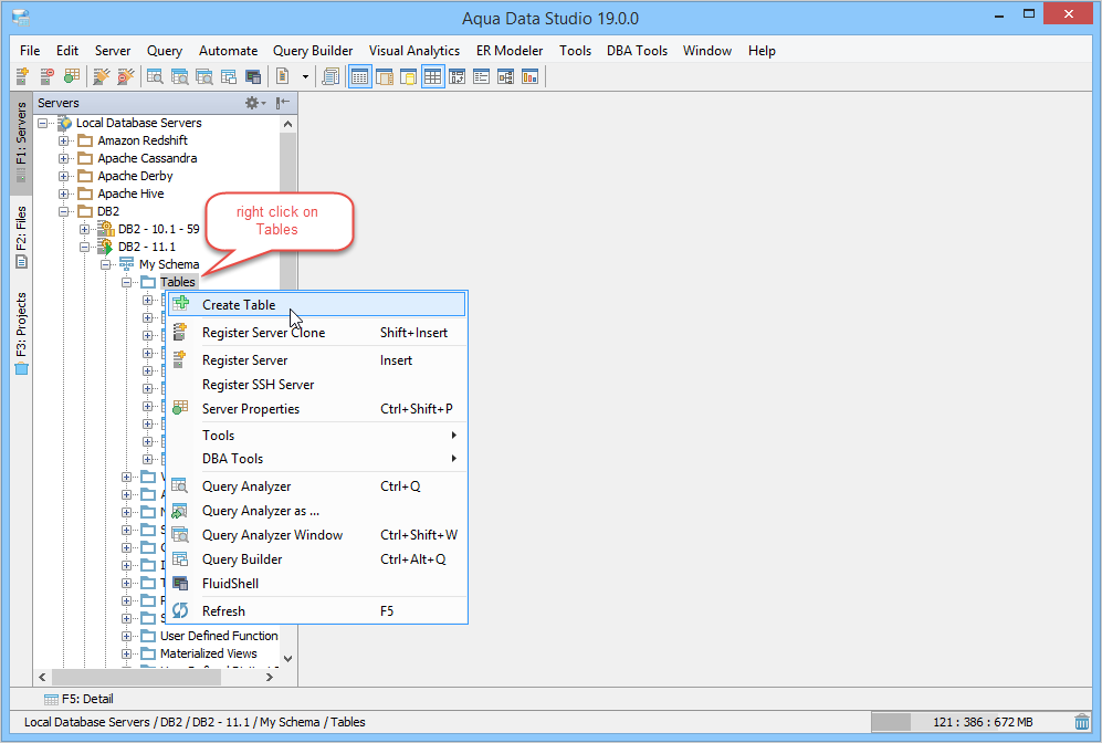 Aqua Data Studio contains GUI tools for visually editing and creating Tables. CREATE Creating tables through the GUI Tools available in the schema browser begins with opening a database server connection and expanding the tree to view the server's tables. Right clicking on the schema container for Tables generates the pop-up menu containing "Create Table" as its first item. The Create Table dialog has General, Constraints, Storage and Preview SQL tabs across the top. The General tab is where the table is named and its columns and datatypes are set. The Column information displays more details about the selected columns in the descriptin area below the column grid. INSERT and DELETE of columns is available via right click on the Column Names within the General tab of CREATE and ALTER dialogs. All of the datatypes available to the current database can be accessed with a dropdown next to the column names. When creating User Defined Table Types in Microsoft Azure SQL, the Create Table dialog shows only the General tab, the Constraints tab and the Preview SQL tab. The Constraints tab allows selection of columns for use in constraint creation (including Primary Key) and check conditions. Constraint properties details such as Name, Type, Ref Schema, Ref Table and Check Condition are modifiable visually. Constraint Definition Table Columns and Referenced Columns can be visually edited. For more on constraints, see the Creating Constraints page. The Storage tab provides details on Tablespace and table storage, its content vary depending on server vendor and version. The Comments tab provides space for text comments that will be stored with the table in the database. Some vendors also allow Table Column Comments, to make comments on specific columns. Where this is available, such comments will also appear ER Models containing tables with these properties. The Preview SQL tab displays the DDL used to generate the table and its properties based on the settings of the other tabs. Below are the steps used to create a table in DB2 10.1. Because other databases may not have dimensions, steps 6 and 7 may not be needed.