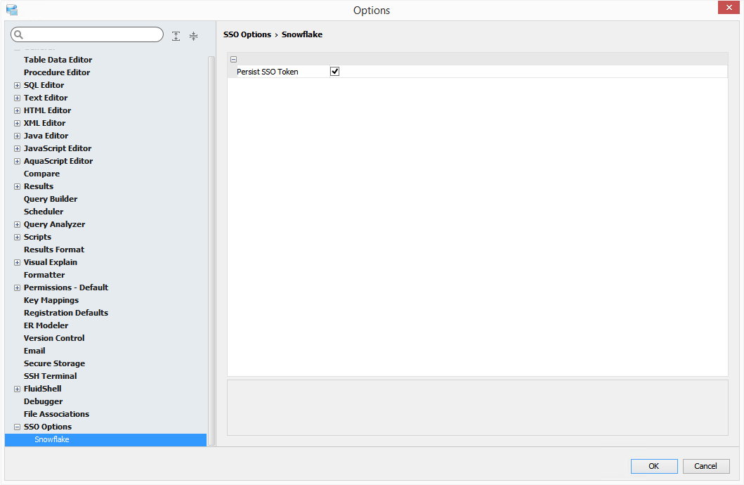 SSO Options Enable the Persist SSO Token option so that the Login persists across Aqua Data Studio sessions. For more on SSO for Snowflake, see the Snowflake page. |