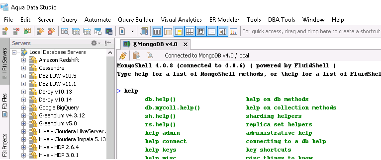 MongoShell provides you a near complete replacement for the command line shell shipped with MongoDB. You get complete control of your MongoDB deployment within a FluidShell-like interface along side all of our MongoDB visual editing tools and Query Analyzer.
