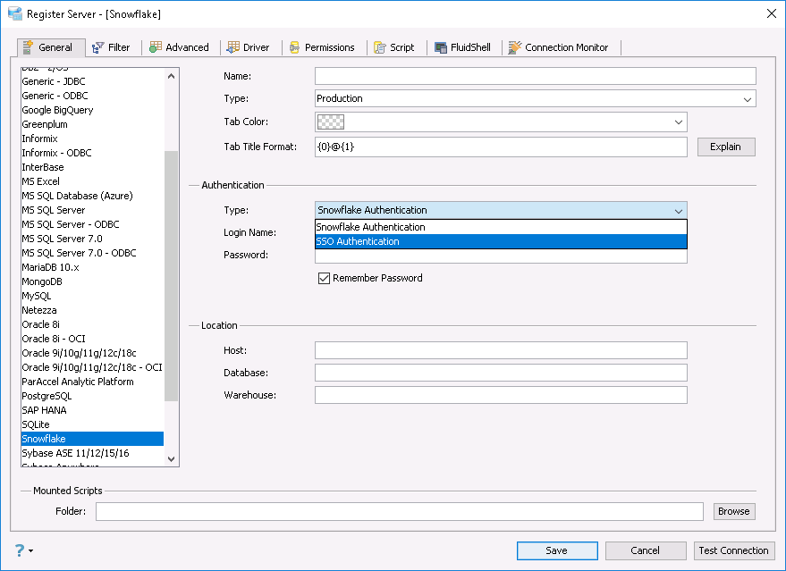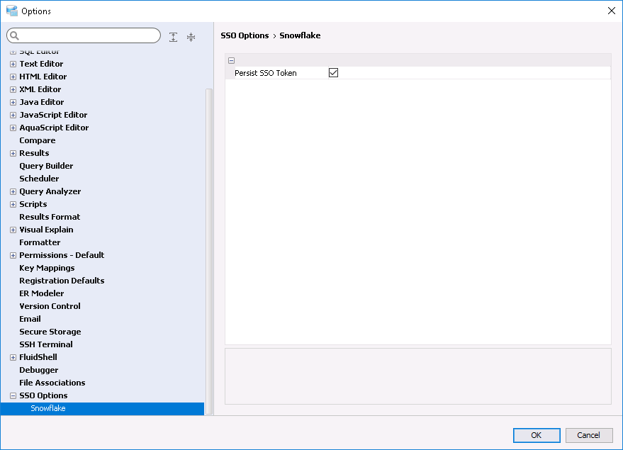 We have added an authentication type drop-down, so you can choose between Snowflake Authentication and SSO Authentication. We also added the Persist SSO Token option for Snowflake in the Options pane. If you check the box, the SSO Token will persist across Aqua Data Studio sessions and you won't be asked for a login every time. The duration of how long the SSO token remains valid is configured within the SSO Provider. Click here to learn more about Snowflake within ADS.