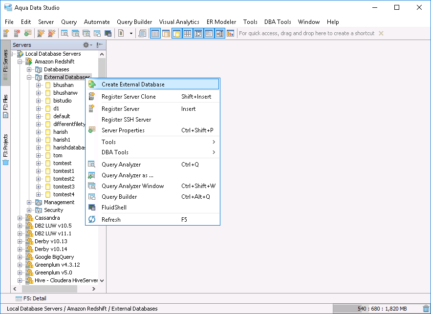 Aqua Data Studio 20.6 adds schema tree support for external databases, external schemas, and external tables. You can now connect to your Amazon Redshift Spectrum external databases, schemas and tables, and work with data that is stored in Amazon S3.