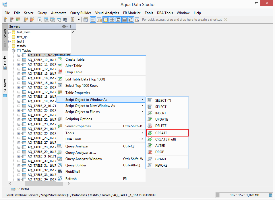 Script a SingleStore (MemSQL) object as CREATE, ALTER or DROP for Aqua Data Studio to generate DDL. With the Schema Script Generator, you can either choose objects to script or script the complete content of a schema.