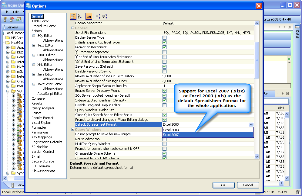 Excel 2007 is now available as an option in "Save Results As" or "View as Spreadsheet", and as a format for generating Pivot Grid and Pivot Grid Charts. Files can be saved as .xls or as .xlsx. Anywhere you can generate Excel results or use the View in Excel Viewer feature within the application you can now select which version of Excel (2003 or 2007) you would like for your output from within File -> Options - > General -> General -> Default Spreadsheet Format.