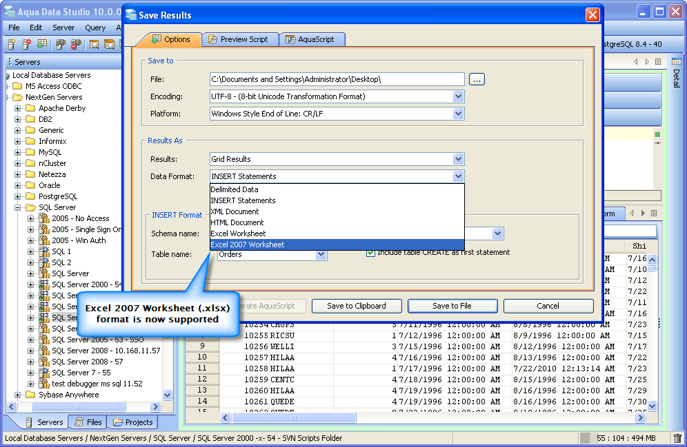 Business Analysts generate reports involving calculations, graphing tools and pivot grids, and they usually share their results in spreadsheet format. To accomplish these tasks, users have to poll external databases, analyze the results, create a spreadsheet and e-mail these on a regular basis. Enhancements to Aqua Data Studio's Query Analyzer has streamlined these tasks by creating one click options to view the result set in a spreadsheet and email the result set as an Excel attachment. With AquaScripts, users can completely automate these tasks and email reports on a recurring basis.