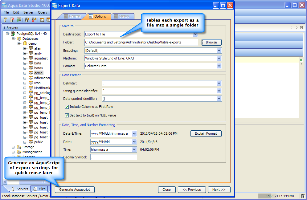 A button has been added to automatically generate an AquaScript to perform an export with the options chosen in the User Interface. The AquaScript can be saved and executed at a later date or scheduled for execution in Aqua Data Server.