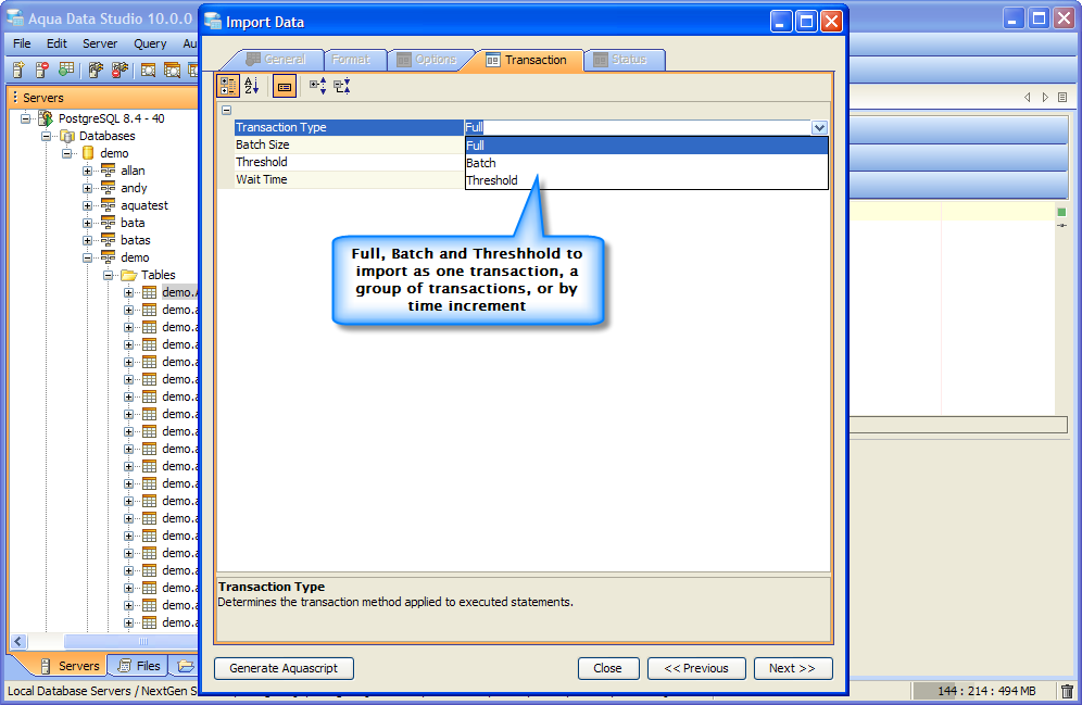 Enterprise environments demand importing and exporting data from hundreds of databases often with vastly different data format requirements. Getting data from a specific database vendor, server and version to another is an around the clock necessity. The larger the amount of data transferred, the greater the need for import and export automation. Data imports and exports can get so large that they overwhelm system resources if not properly managed and segmented and they often require the entire process to be restarted. This version's Import and Export Tool Enhancements tackle these problems via new configurable transaction types, improved IO performance and one-click options for AquaScript Generation.
