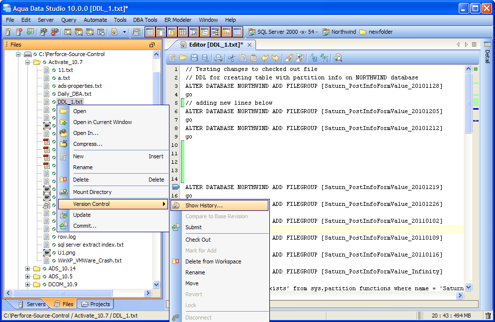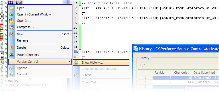 Perforce integration in Aqua Data Studio v10.0 includes: