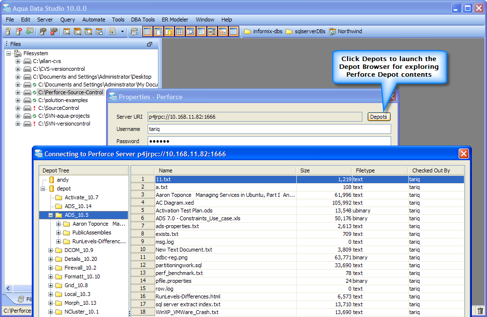 To work with Perforce master file repository in Aqua Data Studio v10.0 you must to first checkout a project by supplying the necessary authentication information.