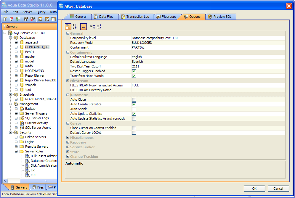 Aqua Data Studio v 11.0 displays the user created Contained Databases in the Server Tree node.