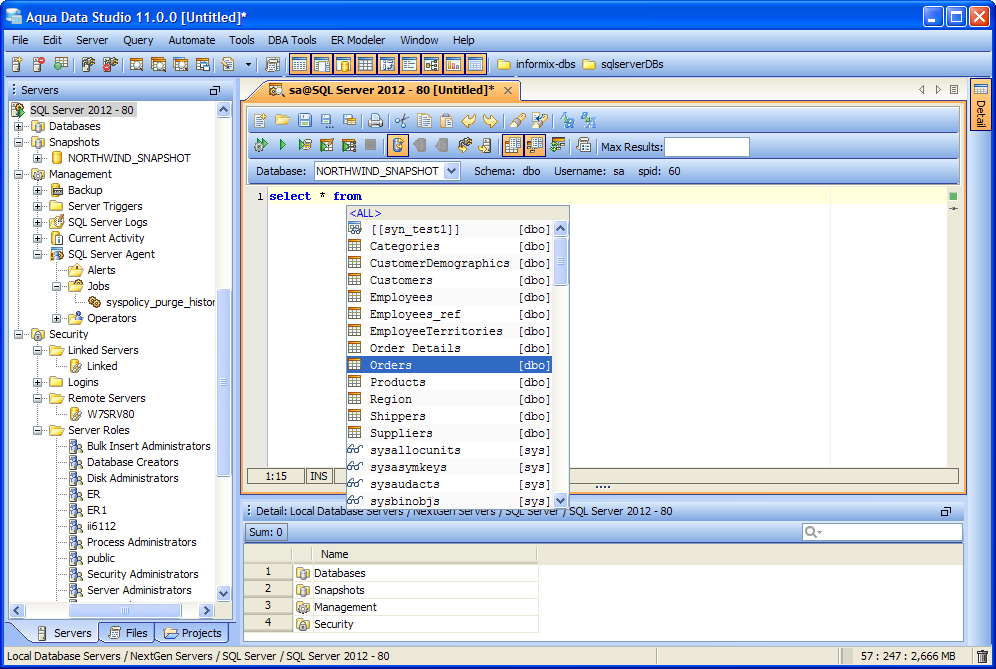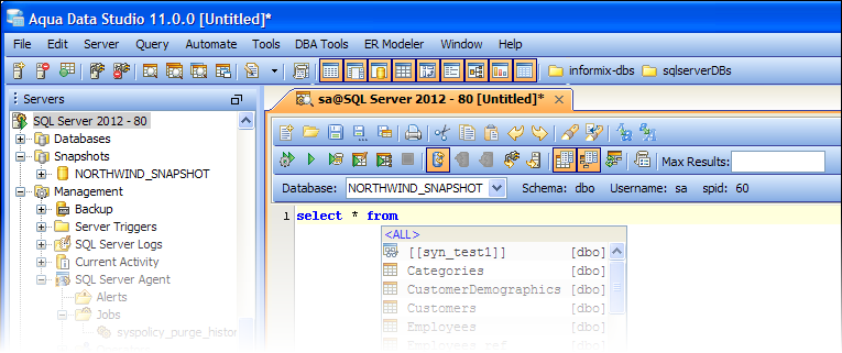 Aqua Data Studio 11.0 now supports SQL Server 2012 designed by Microsoft, a high performance analytic database with cloud-ready information platform. With Aqua Data Studio version 11.0, you can register a SQL Server 2012 Server and use the different features available such as Query Analyzer Window, Visual Editors, Table Data Editor, Import/ Export Tools, ER Modeler and Schema Script Generator. DBA Tools, Visual Editing tools to manage the SQL Server 2012 Users and Groups as well as Create Databases, Schemas, Tables, Views and Functions are also available.