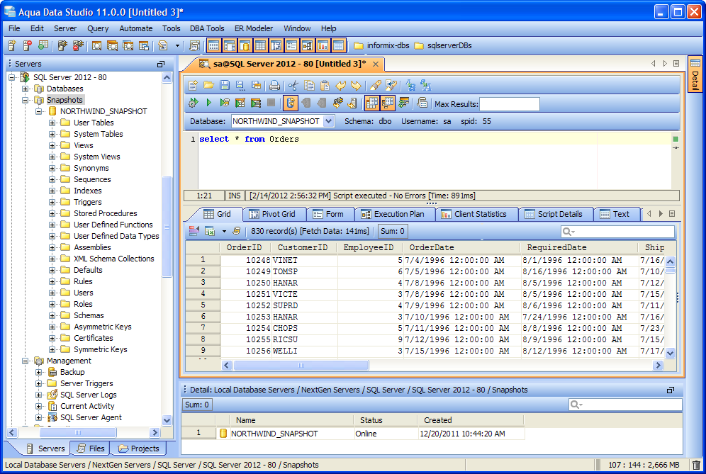 SQL Server 2012 now has a Snapshot Database node which is featured in the Server Tree in Aqua Data Studio.