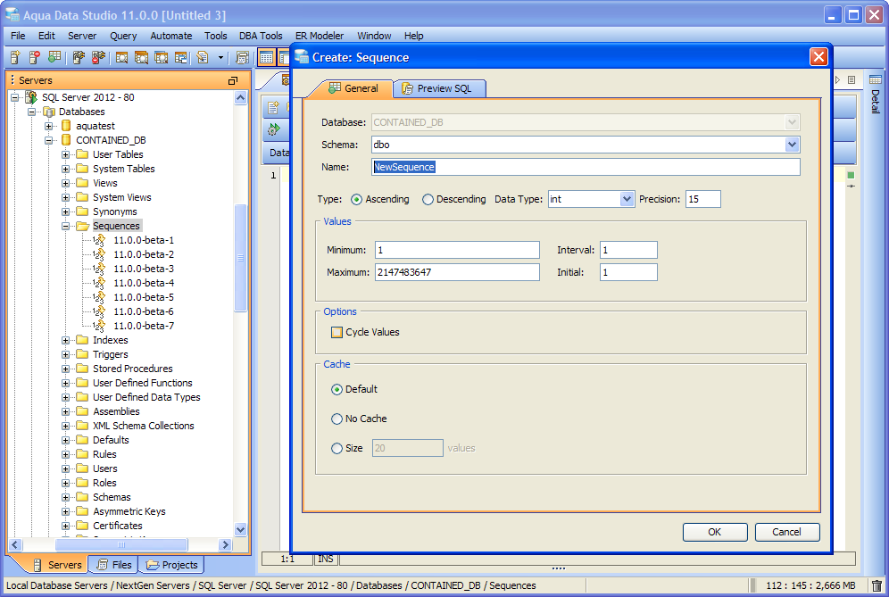 Create Sequence is now supported in Aqua Data Studio 11.0. Sequences have been requested by the SQL Server community for years, and it's included in this release. Sequence is a user defined object that generates a sequence of a number.