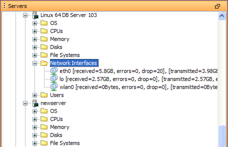 The network information are displayed under Network Interfaces. The received and transmitted packets and bytes passing through the network, errors, packets dropped, FIFO buffer errors, packet framing errors, compressed packets and multicast frames are captured under this node.