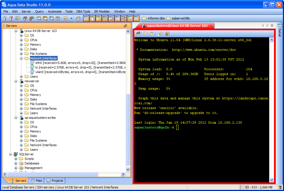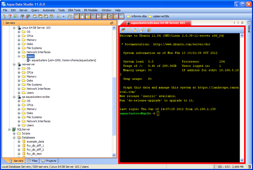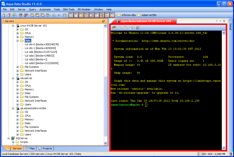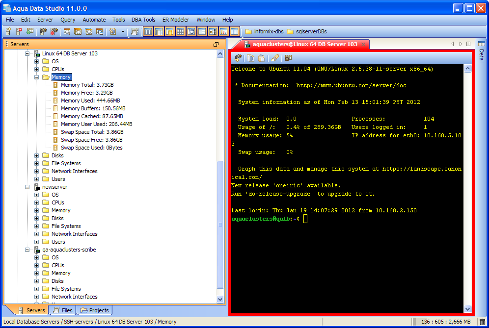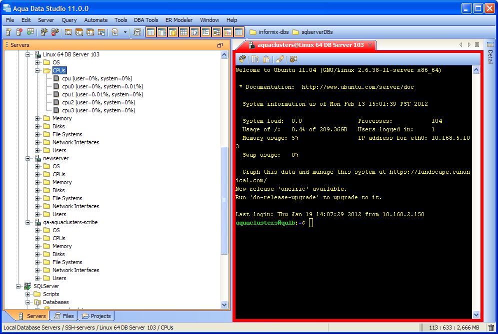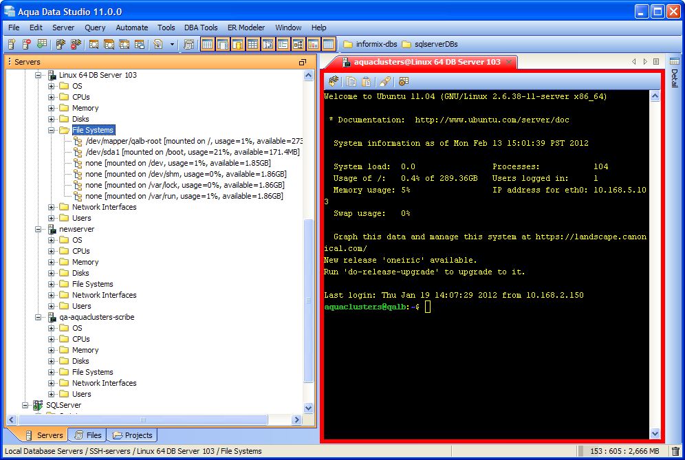 Aqua Data Studio 11.0 features an SSH Server Browser that provides an overview of your Unix based Servers based in information in your Proc Filesystem. The purpose of the SSH is to help you visualize and maintain your SSH Server. The SSH Browser in Aqua Data Studio v11.0 makes uses of procfs (or the proc filesystem), a special filesystem in UNIX-like operating systems that presents information about processes and other system information in a hierarchical file-like structure, providing a more convenient and standardized method for dynamically accessing process data held in the kernel than traditional tracing methods or direct access to kernel memory. Typically, it is mapped to a mount point named /proc at boot time. You can quickly view server version information, including: OS, CPUs, Memory, Disks, File Systems, Network Interfaces and the different Users.