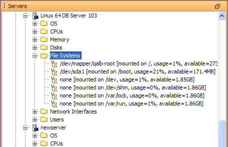 The FileSystem information is displayed under this node. The SSH Browser displays the mounts of the different File System in the Server. Other information displayed are the total space, used space and available space in the system.