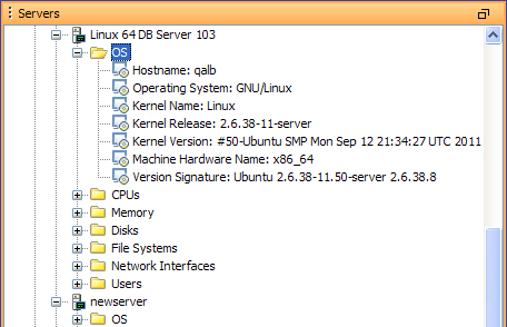The OS node displays the Hostname, Operating System, Kernel Name, Kernel Release, Kernel Version, Machine Hardware Name and Version Signature of the Linux Server.