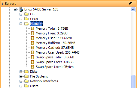 The memory node displays the Memory information and the Swap space. The total memory, free memory, memory used, memory buffers, cached memory, memory user used, total swap space, free swap space and used swap space are the information that is displayed.