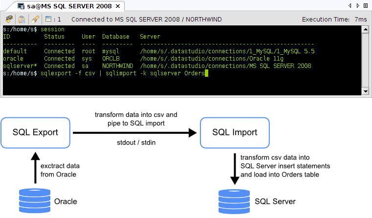 FluidShell is an interactive shell which combines the power of SQL command line with the versatility of a Unix shell. SQL Command Line features let you connect to databases, execute queries, change history buffer and more. Then, take the output of your SQL statements and run them through powerful Unix functionality such as grep, pipelining, input/output re-direction and variable substitution to extract and transform your data any way you choose. Plus, we've exposed many of Aqua Data Studio's native UI features via command line. So you can invoke import/export operations, schema compares and more directly from the command line. Learn more