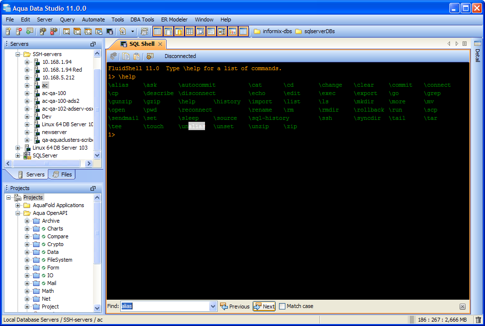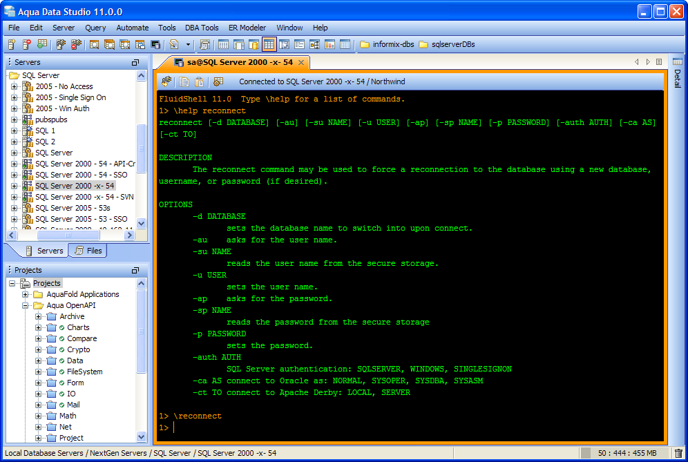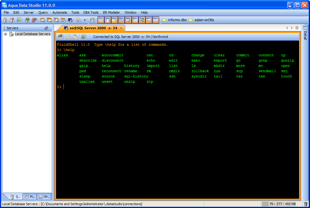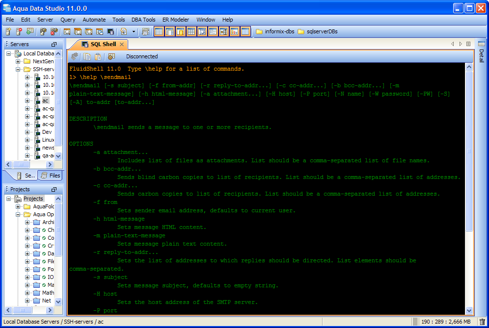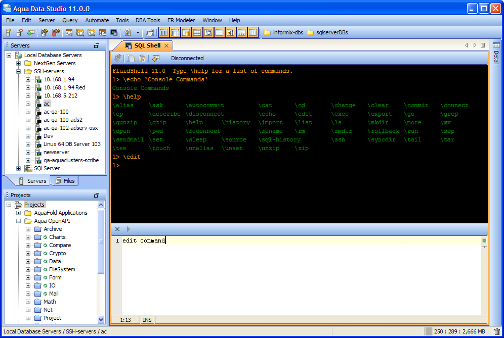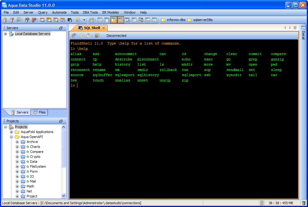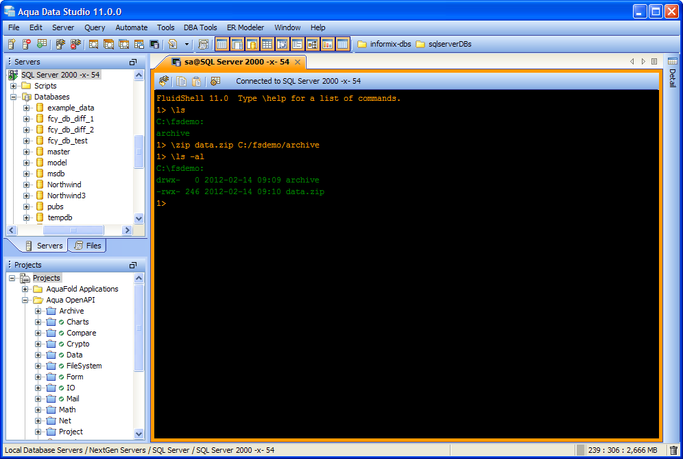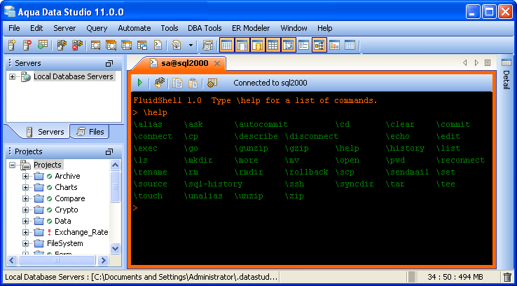 Aqua Data Studio now includes an integrated shell named FluidShell. FluidShell is an interactive database shell for all major database vendors which provides the combined functionality of a Unix Shell 1 with a SQL command line 2 tool. This combination of functionality grants users the power to automate the extraction, transformation and loading of data from within a single shell. FluidShell includes commands that match common Unix commands and functionality similar to most Unix shells such as variable substitution, alias commands, command substitution, input/output redirection, pipelines and command history. FluidShell can execute SQL scripts, shell scripts and AquaScripts to provide a diverse and flexible method to automate your daily tasks. Automate more and do more in less time.
