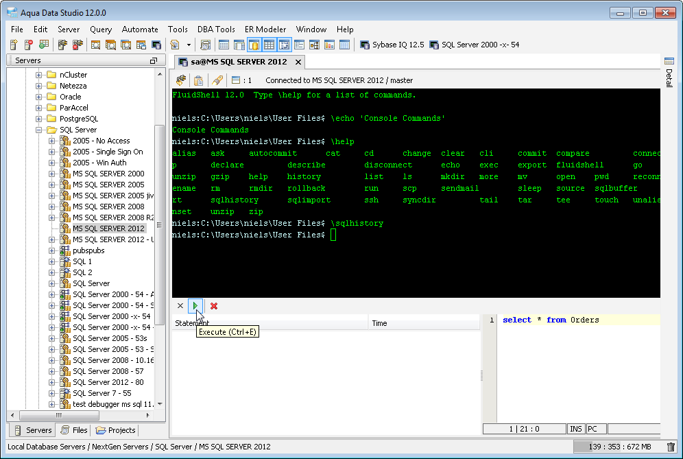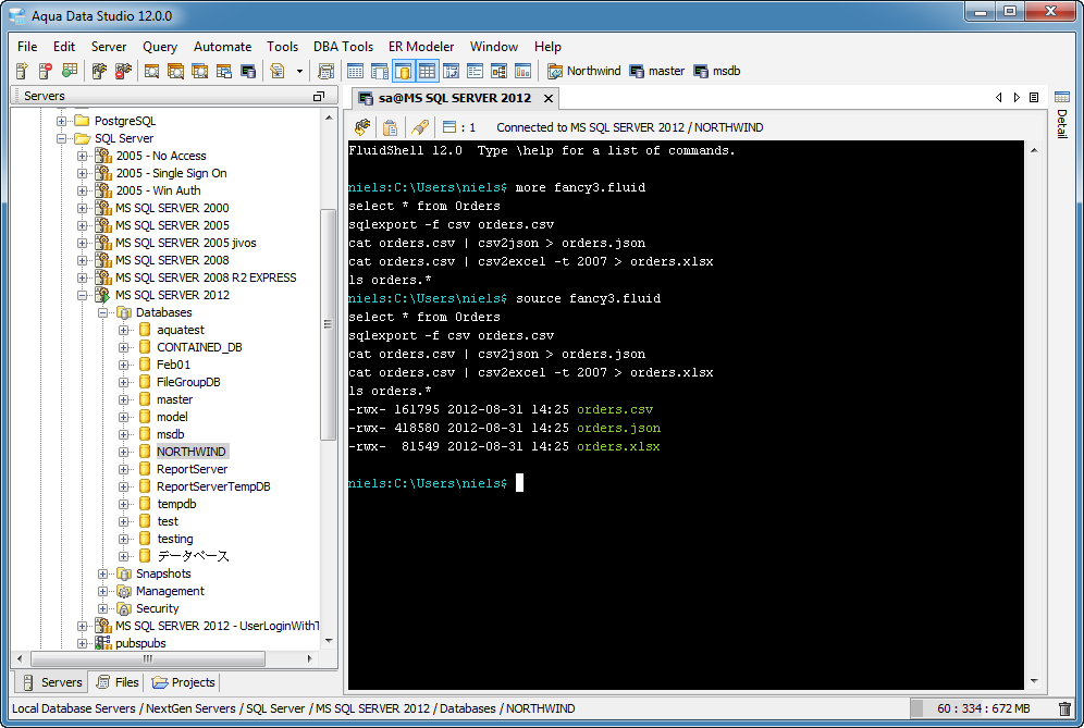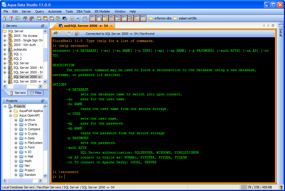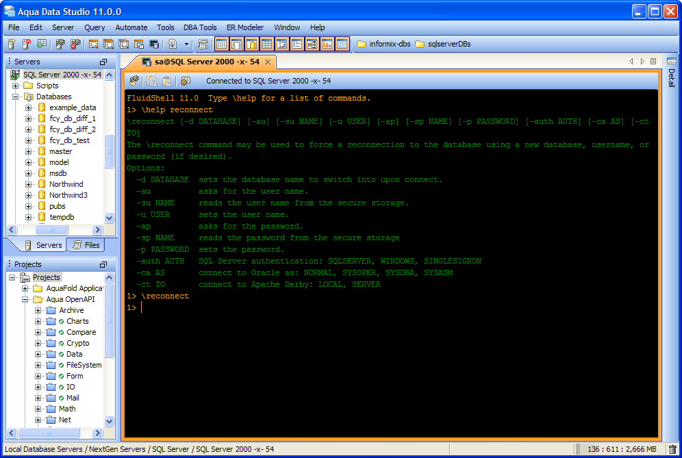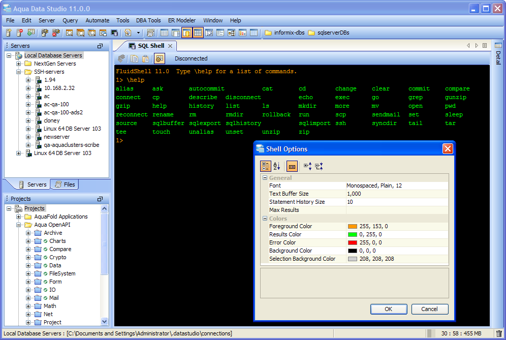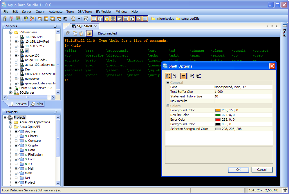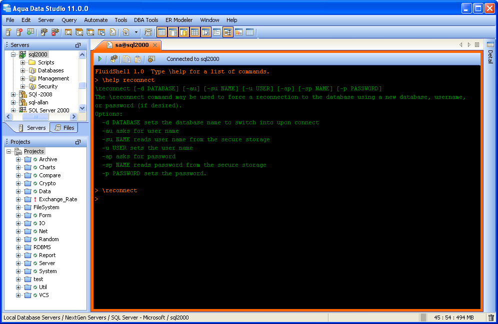 Aqua Data Studio now includes an integrated shell named FluidShell. FluidShell is an interactive database shell for all major database vendors which provides the combined functionality of a Unix Shell 1 with a SQL command line 2 tool. This combination of functionality grants users the power to automate the extraction, transformation and loading of data from within a single shell. FluidShell includes commands that match common Unix commands and functionality similar to most Unix shells such as variable substitution, alias commands, command substitution, input/output redirection, pipelines and command history. FluidShell can execute SQL scripts, shell scripts and AquaScripts to provide a diverse and flexible method to automate your daily tasks. Automate more and do more in less time.