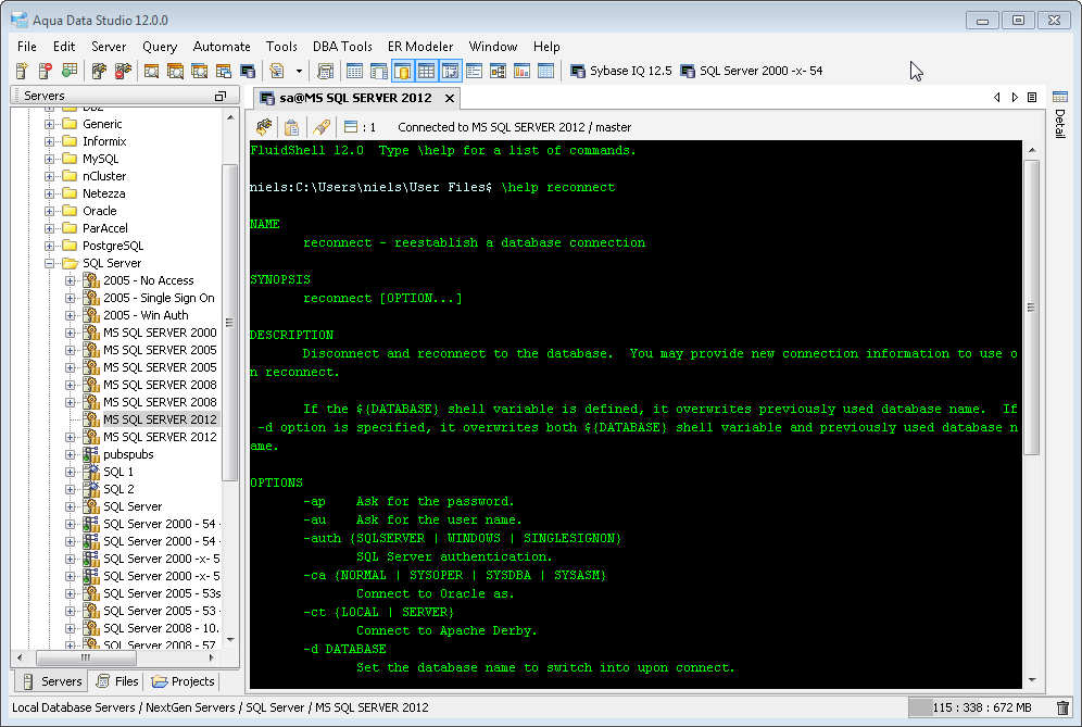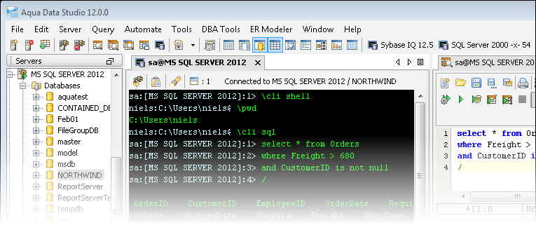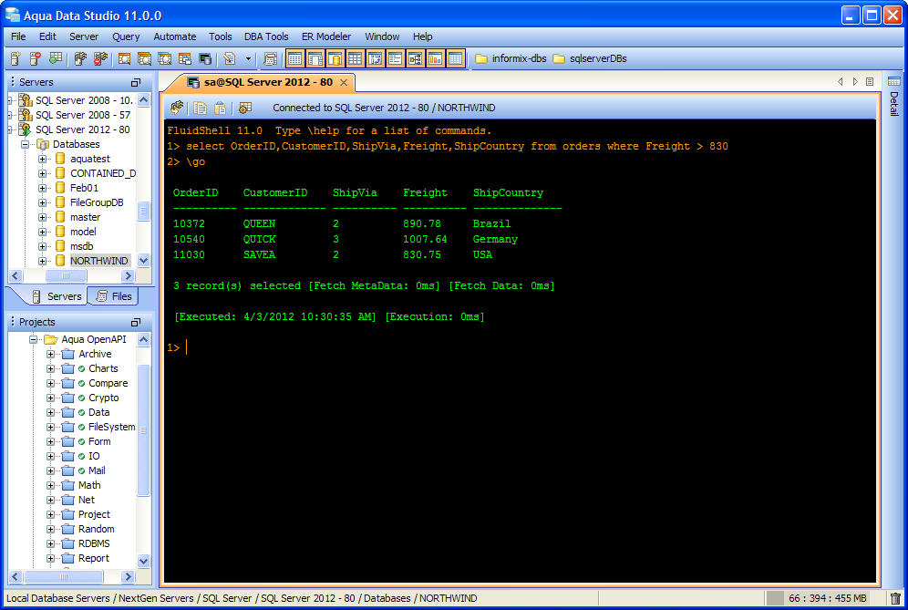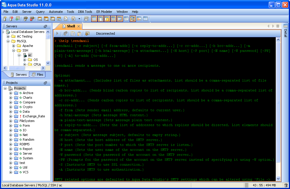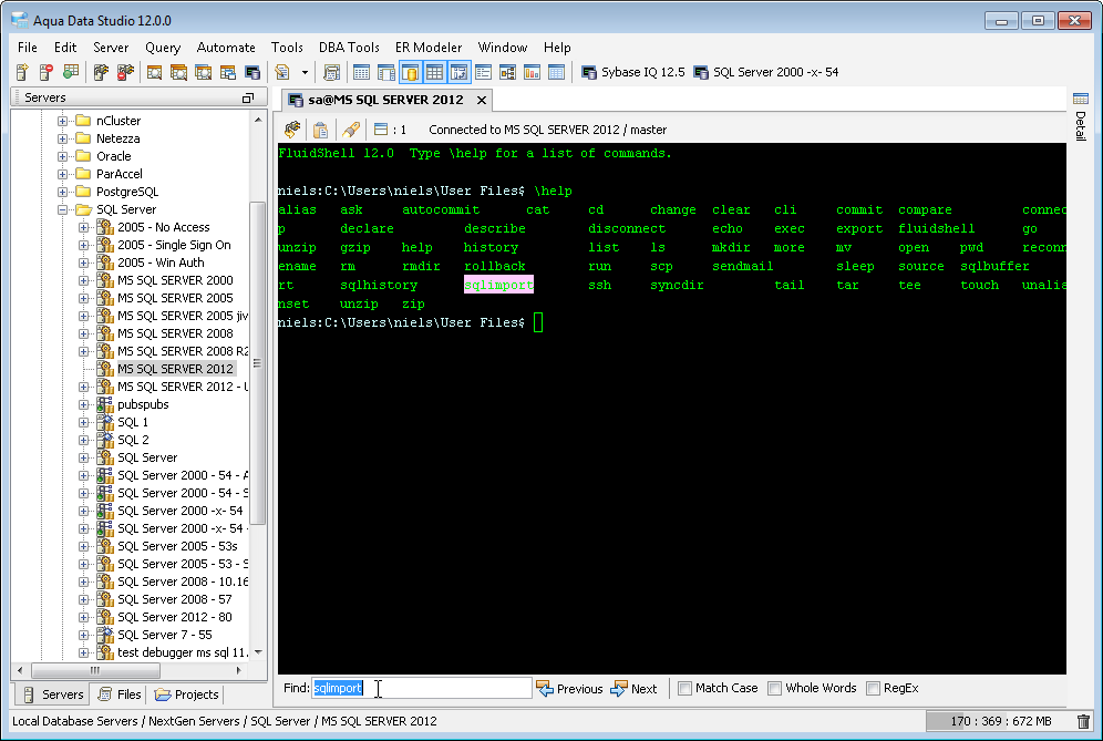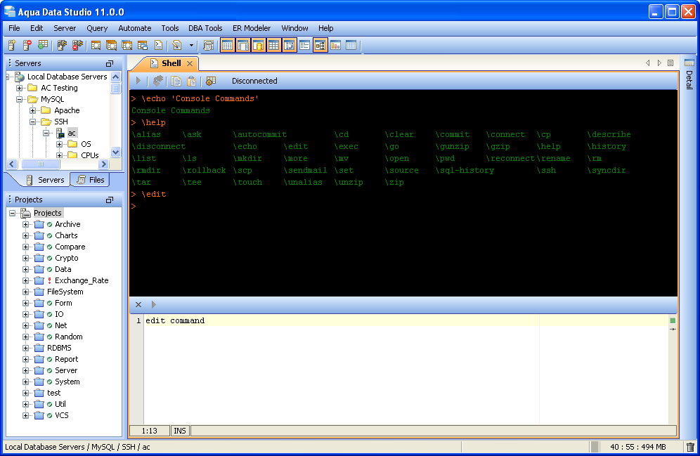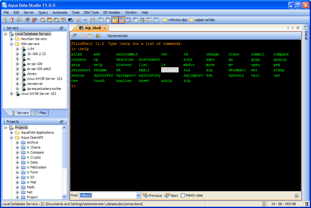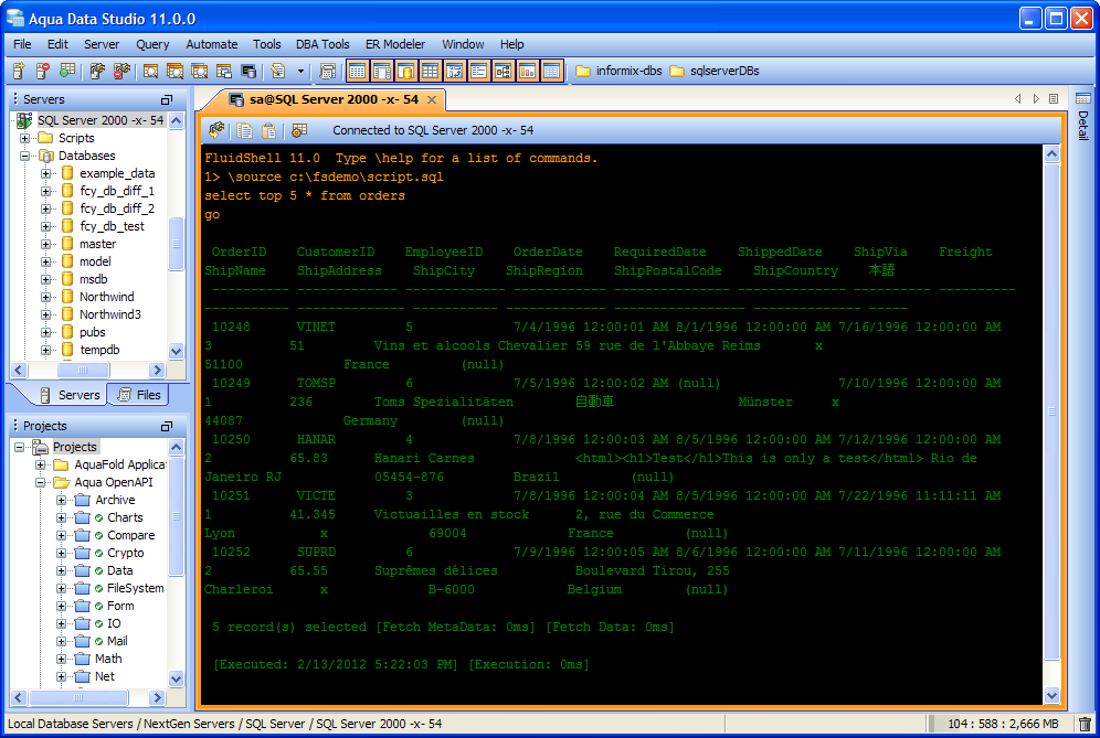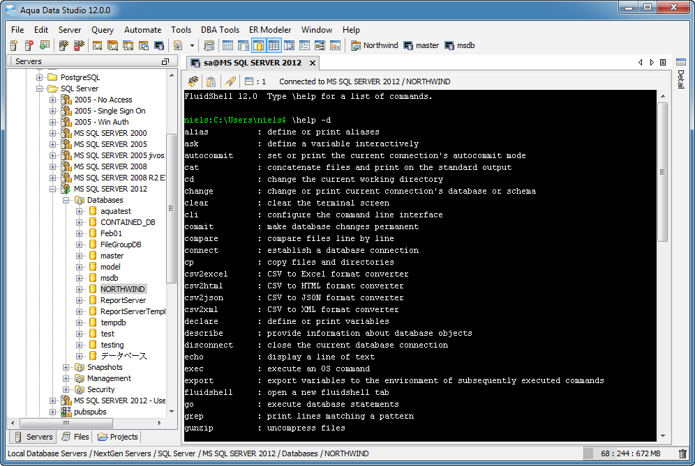 Aqua Data Studio now includes an integrated shell named FluidShell. FluidShell is an interactive database shell for all major database vendors which provides the combined functionality of a Unix Shell 1 with a SQL command line 2 tool. This combination of functionality grants users the power to automate the extraction, transformation and loading of data from within a single shell. FluidShell includes commands that match common Unix commands and functionality similar to most Unix shells such as variable substitution, alias commands, command substitution, input/output redirection, pipelines and command history. FluidShell can execute SQL scripts, shell scripts and AquaScripts to provide a diverse and flexible method to automate your daily tasks. Automate more and do more in less time.